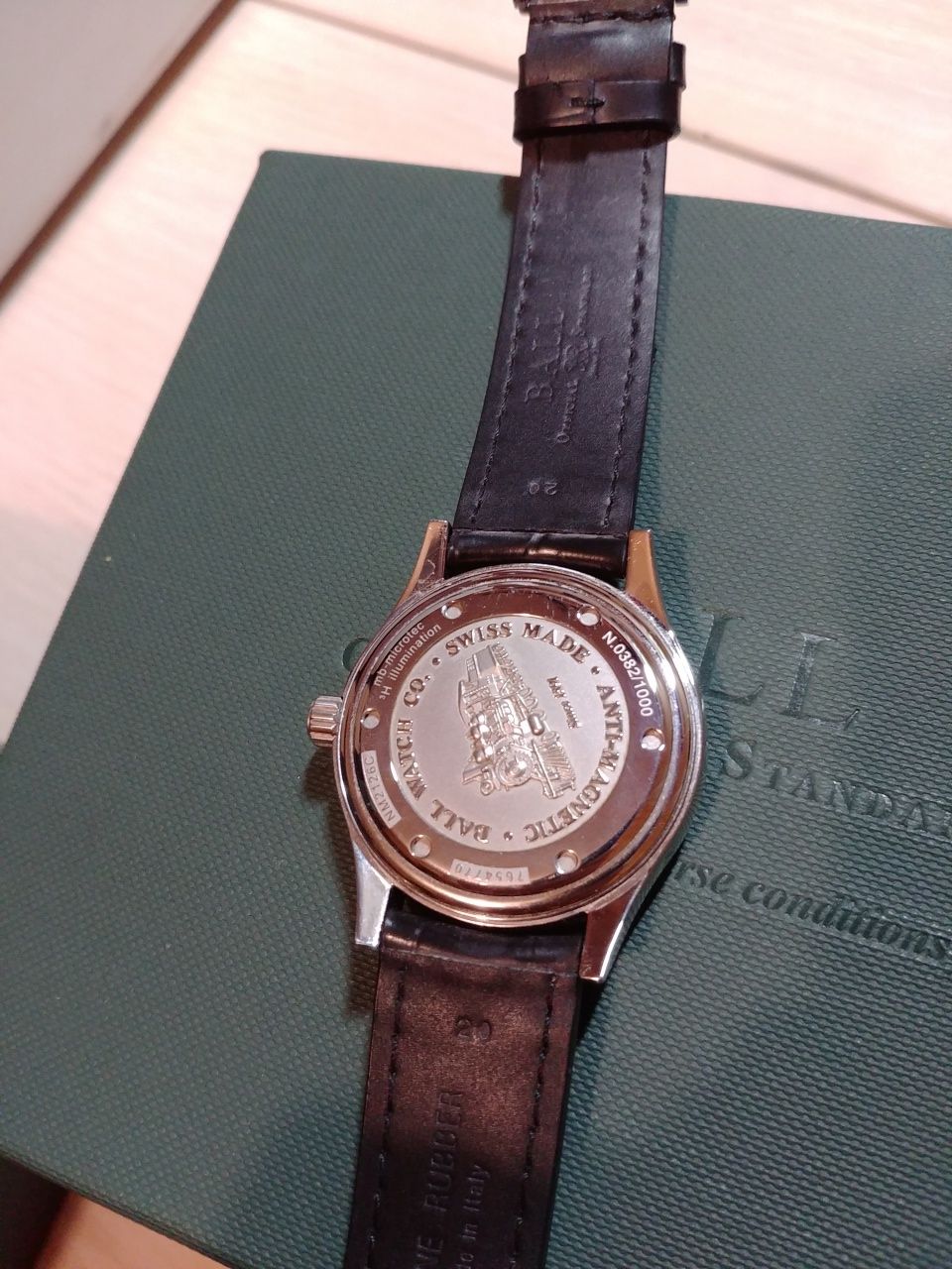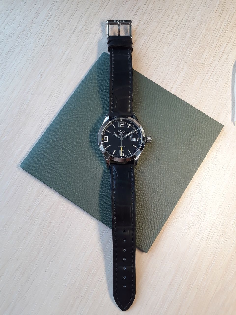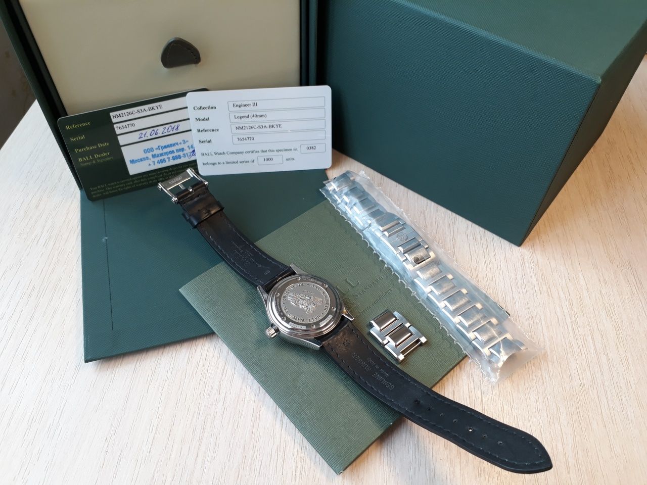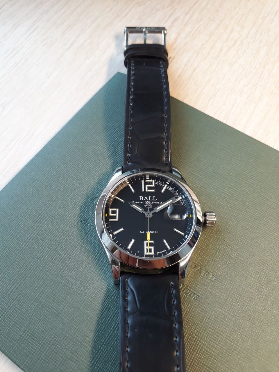 Продам отличные часы полученные по предзаказу в этом году в июне. Механизм BALL RR 1101, на основе ETA 2892. Антимагнитная защита до 80 000 а/м. Размер корпуса 40 мм. Тритиевая подсветка желтого цвета. Ход отличный, около +2 сек в сутки, при активной носке. Родной браслет изрядно поцарапан, на самом деле он просто полированный и царапается от взгляда (ничего страшнее офисного поюза часам не доставалось). В комплекте отдам отличный оригинальный резиновый ремешок с оригинальной стальной баклей. Ремешок сделан под крокодила, с обратной стороны так и не отличишь от кожи. Ремешок носился буквально один день. На корпусе часов только микроцарапки, которые возможно разглядеть только с лупой.