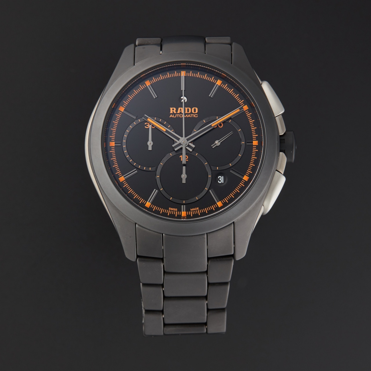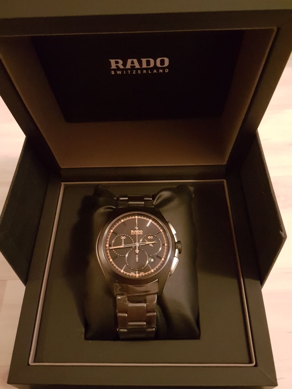 Rado Hyperchrome из коллекции XXL Court представляет собой моноблочную керамическую конструкцию. Весь корпус - в частности, наконечники, центр корпуса и рамка - изготовлены из одного куска керамики и нет внутреннего стального сердечника; это твердая керамика. С каждой стороны корпуса по одному установлены вкладыши из нержавеющей стали. С правой стороны эта вставка содержит прорезиненную коронку с логотипом Rado, а также толкатели хронографа. Эти удлиненные, извилистые стальные вставки гармонируют с общим стилем часов. Материал 45-миллиметрового корпуса называется hyperchrome. Hyperchrome больше похож на необычный металлический сплав, чем на керамику. В зависимости от условий освещения его можно рассматривать как матовый, темно-серый, а в некоторых более редких случаях он показывает металлический блеск. Hyperchrome также означает «моноблочную» конструкцию, то есть в материале нет внутреннего стального сердечника, окруженного керамикой. Корпус, в данном случае, полностью керамический. Жидкая форма керамики вводится в форму, которая уже содержит все отверстия для браслета, боковых вставок толкателей. В этой форме оксид циркония подвергают чрезвычайно высокому давлению (1000 бар), затем охлаждают и удаляют из формы, после нагревают до сверхвысокой температуре 1450 градусов Цельсия в печи для окончательной обработки. Результатом является материал, который имеет уникальный, несколько металлический вид, но, тем не менее, устойчивый к царапинам, как и любой другой вид керамики. Часы RADO hyperchrome будут выглядеть как новые даже годы или десятилетия спустя. Этот моноблочный дизайн уникален. Rado до сих пор не делится секретом с другими брендами Swatch Group.