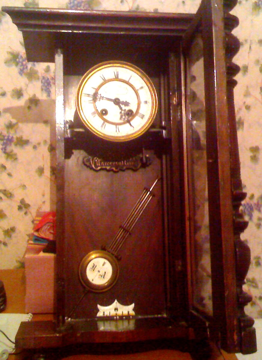 Я приложил страничку из каталога GB 1912 года, на них изображены часы в корпусах, аналогичных вашему. Заодно можете оценить, как оригинально выглядело навершие ваших часов и их нижняя часть. Если есть знакомый краснодеревщик - восстановить будет не трудно. Вариаций исполнения точеных полуколонн по бокам дверцы было масса (вот тут можно посмотреть на каталог).