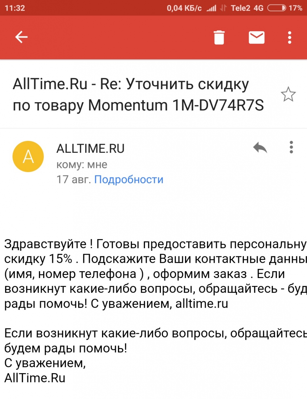 При регистрации на сайте дают скидку 10% а я просто онлайн оператору написал на сайте и попросил 15% и как раз на Momentum, дали