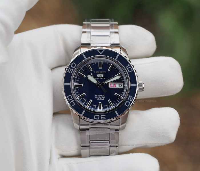 Темно-синий циферблат, накладные метки, окантовка даты и лого Seiko 5