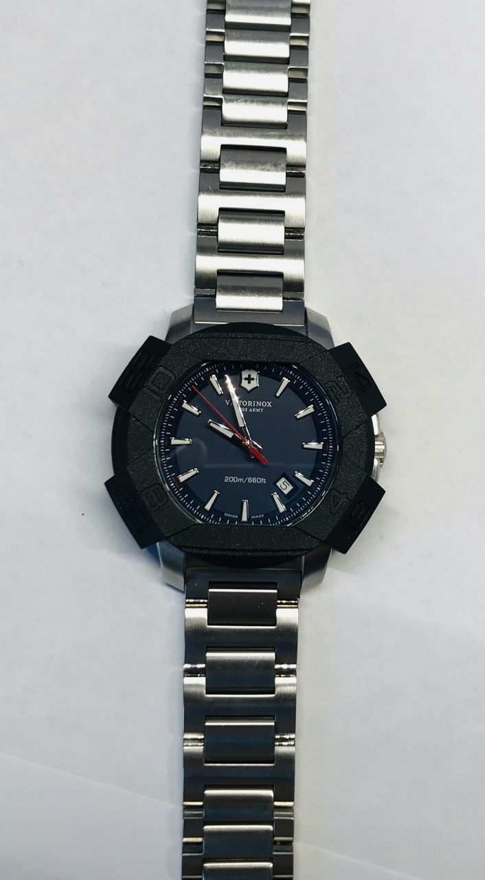 Слово «Inox» в переводе с французского означает «нержавеющая сталь». Специалисты Victorinox выбрали достаточно распространённую нержавеющую сталь 316L для производства часов I.N.O.X. Сталь 316L содержит до 3% молибдена, именно поэтому и позволяет корпусу уверенно противостоять коррозии и перепадам температур. Кстати, о последних – I.N.O.X отлично чувствуют себя при морозе в -50 и жаре в +70. Корпус модели сотворён из цельного куска стали, обработанной на особом станке. Метки циферблата штампованы на корпусе и являются его частью, а не просто нанесены на поверхность, как это встречается на других часах. Посадочные «гнёзда» стрелок циферблата усилены. Заводная головка снабжена дополнительной защитой. Толщина сапфирового стекла - 2.3 мм.
