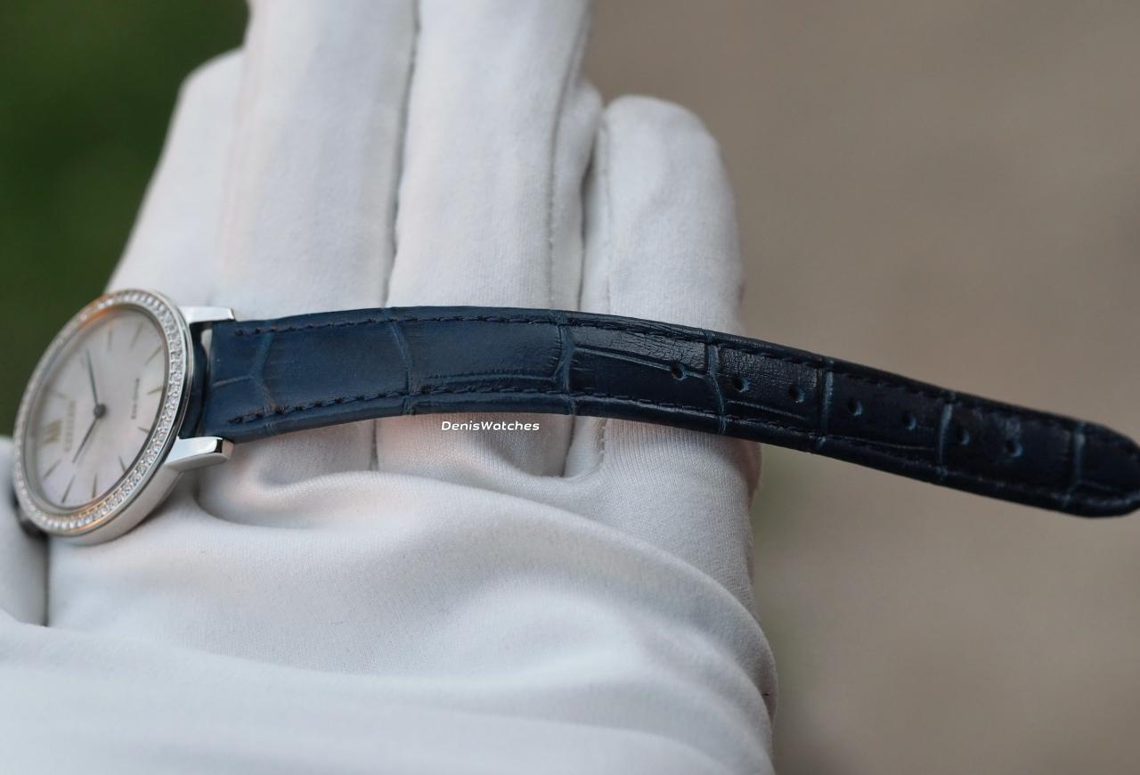 Синие лаковые стрелки отлично сочетаются с темно-синим ремнем