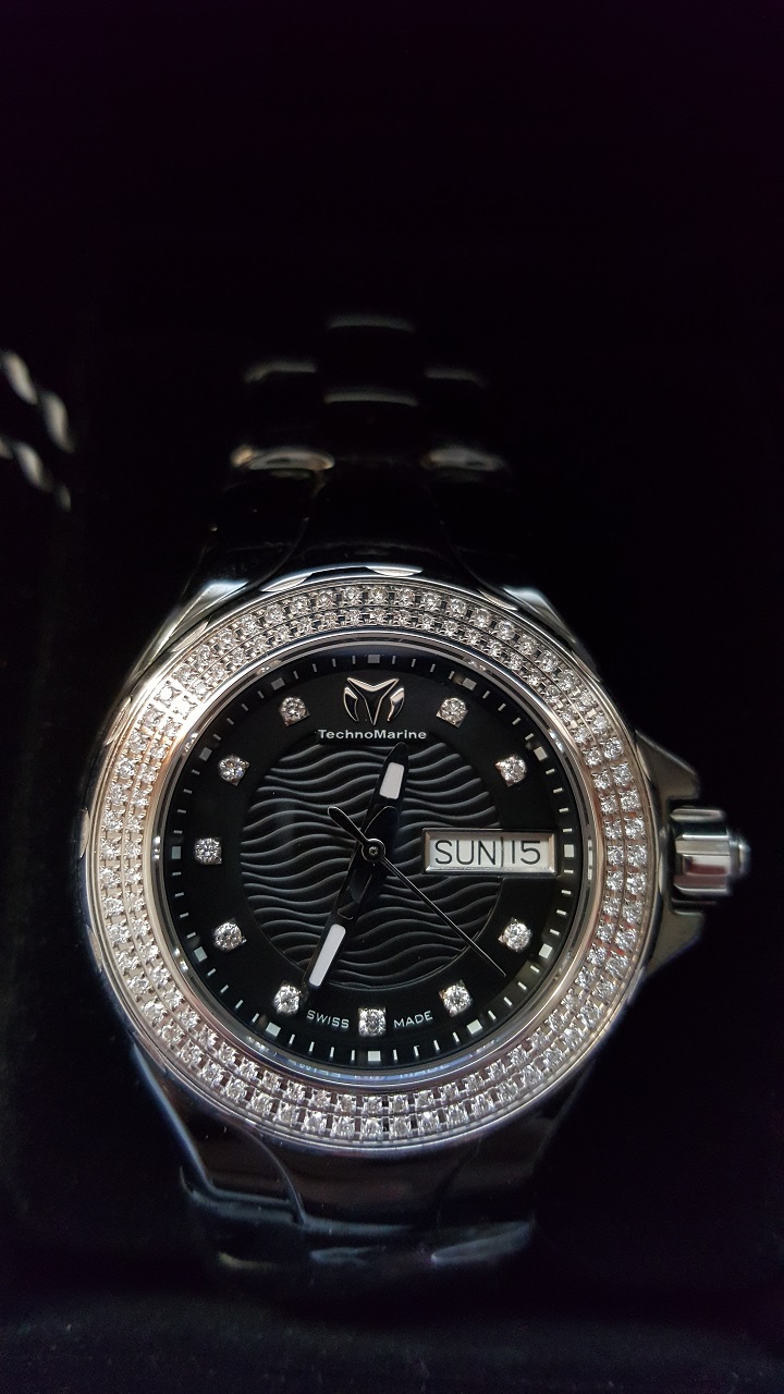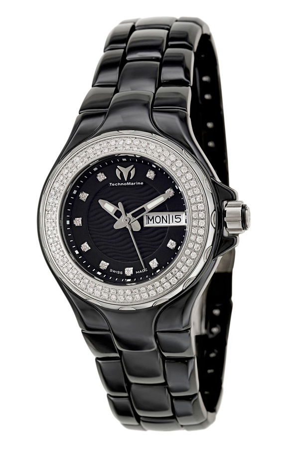 Калибр Ronda 507. Индикация числа и дня недели. Безель украшен 136 бриллиантами 0,86К, циферблат - 10 бриллиантами 0,12К. Корпус и браслет из высокотехнологичной керамики. Сапфировое стекло с антибликовым покрытием. Диаметр корпуса 36 мм.