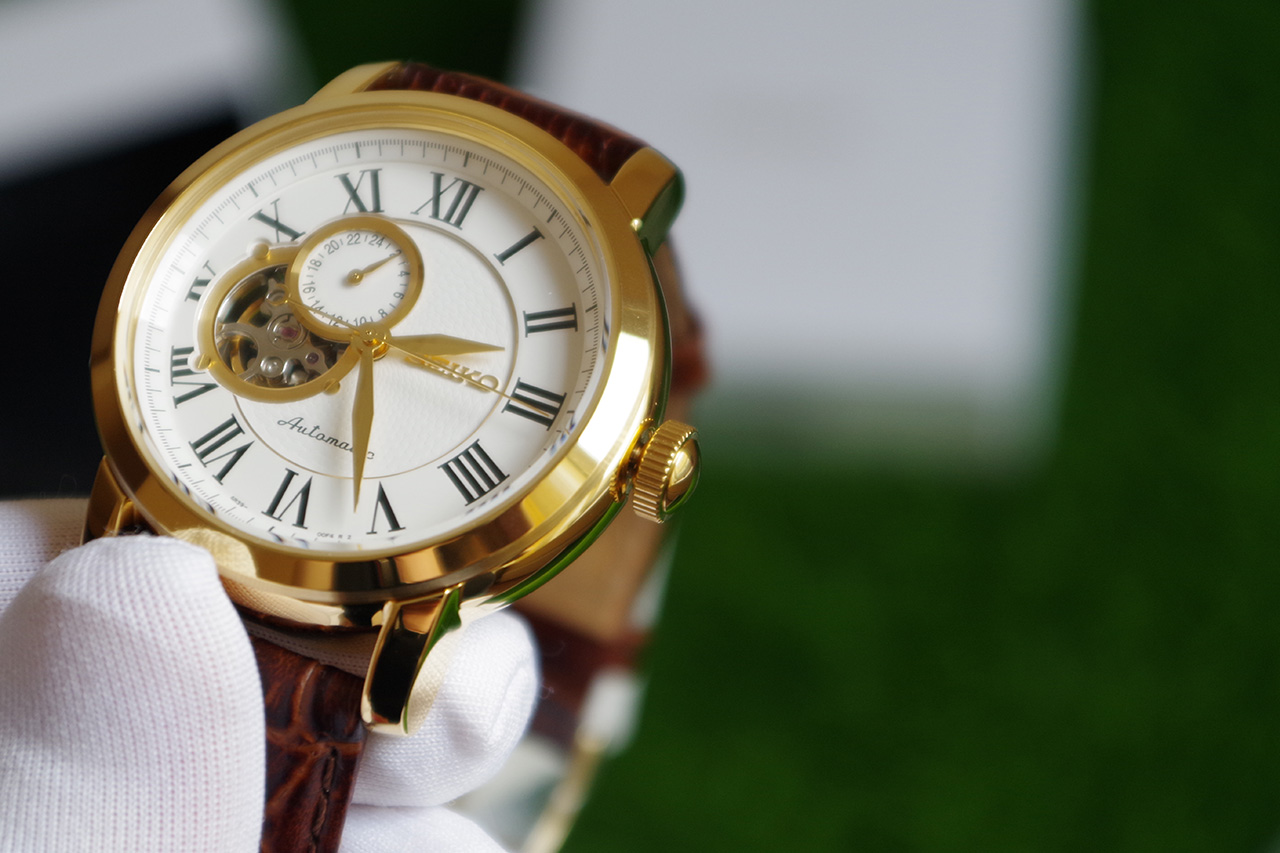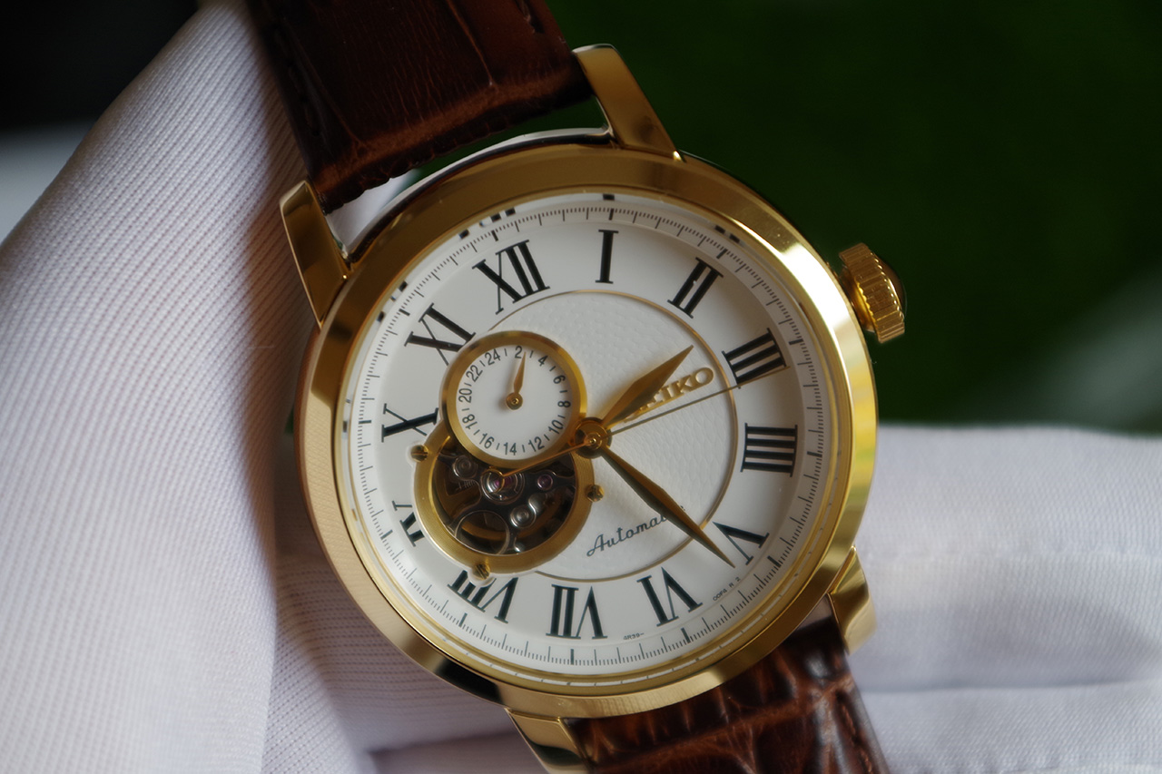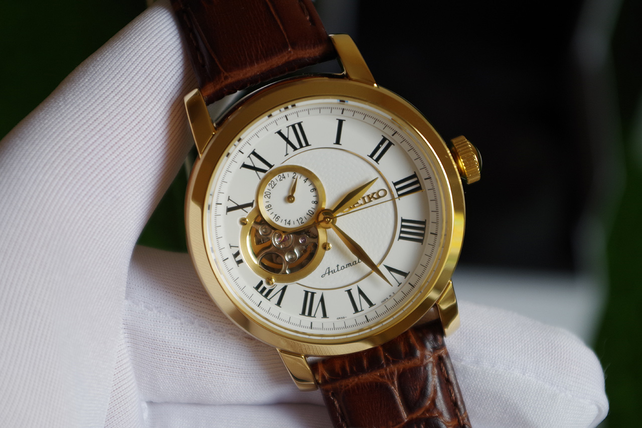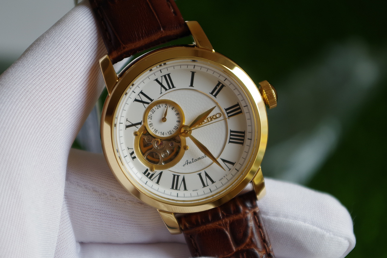 Presage. В механизме 24 камня, частота 21600 полуколебаний в час. Запас хода 41 час. Возможность ручного завода. 12-ти и 24-х часовой формат времени. Сквозь прозрачное окошко на циферблате можно наблюдать за работой механизма часов. Прозрачная задняя крышка.