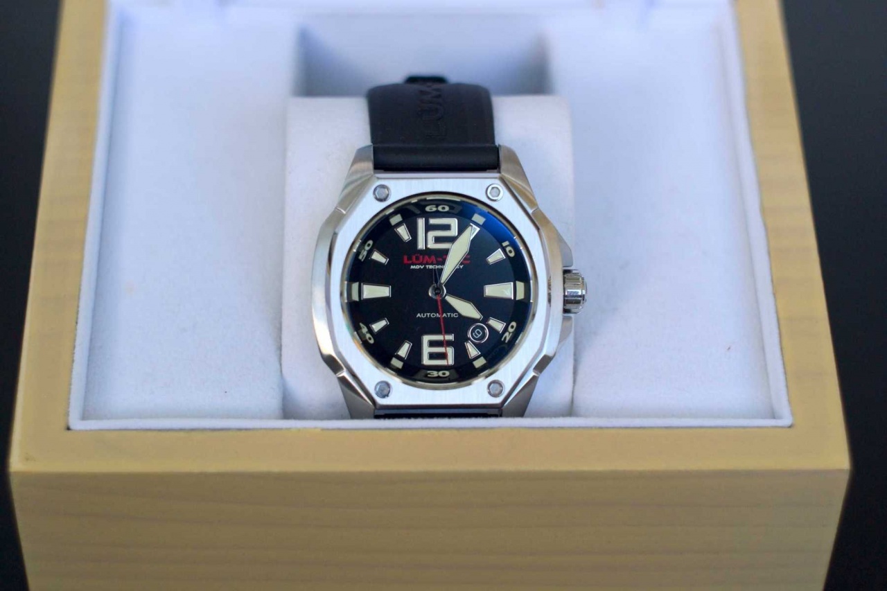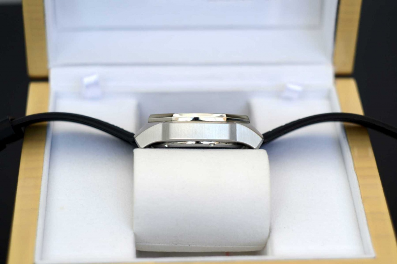 Ширина 44 мм, толщина 13,5 мм, вес на кожаном ремне 123 г