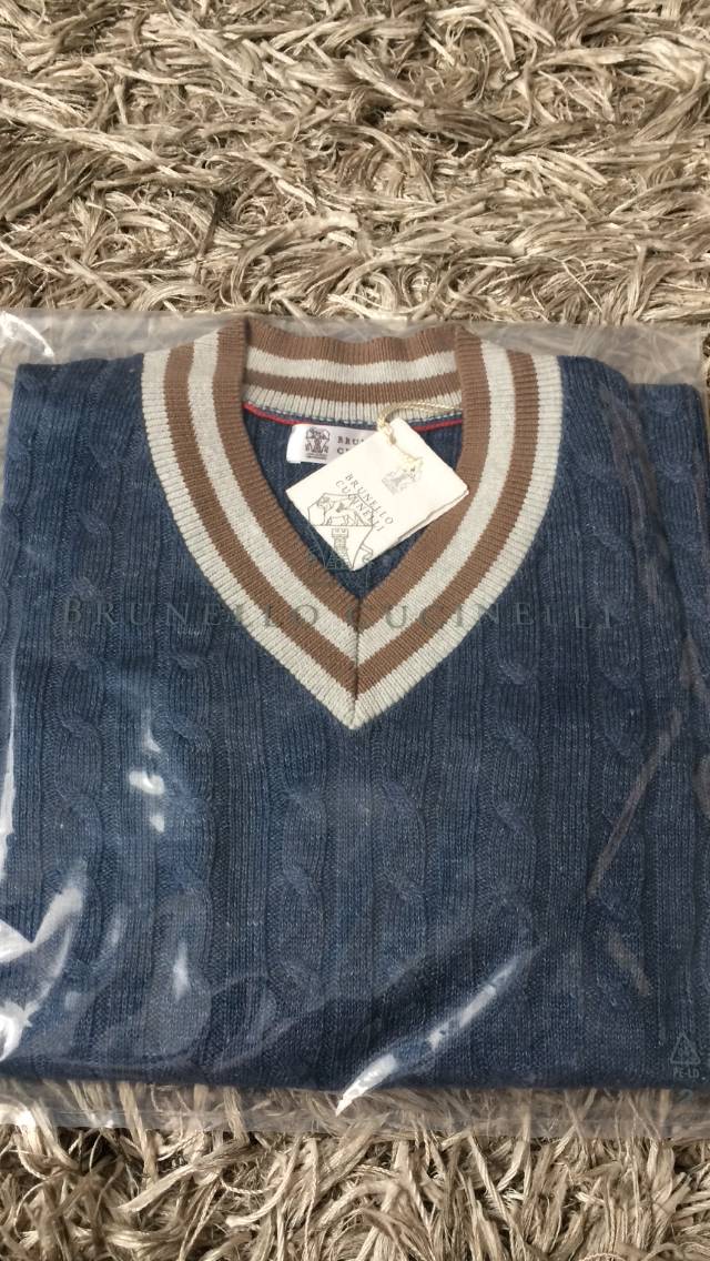 BRUNELLO CUCINELLI новый мужской джемпер TENNIS STRIPES с V-образным вырезом(48 размер)