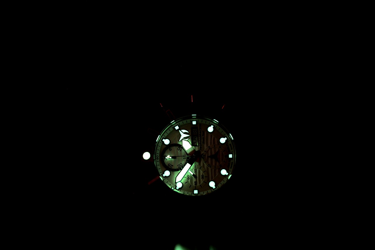 Часовая, минутная и обе секундные стрелки, а также метки с ярким светонакопителем.