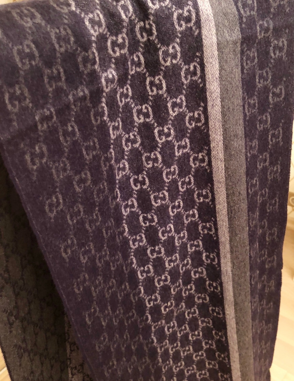 Шарф ⭐️ GUCCI ⭐️ Теплый, 50% КАШЕМИР 50% ШЕРСТЬ. Синие-фиалковый рисунок GG-Supreme, серая лента Web