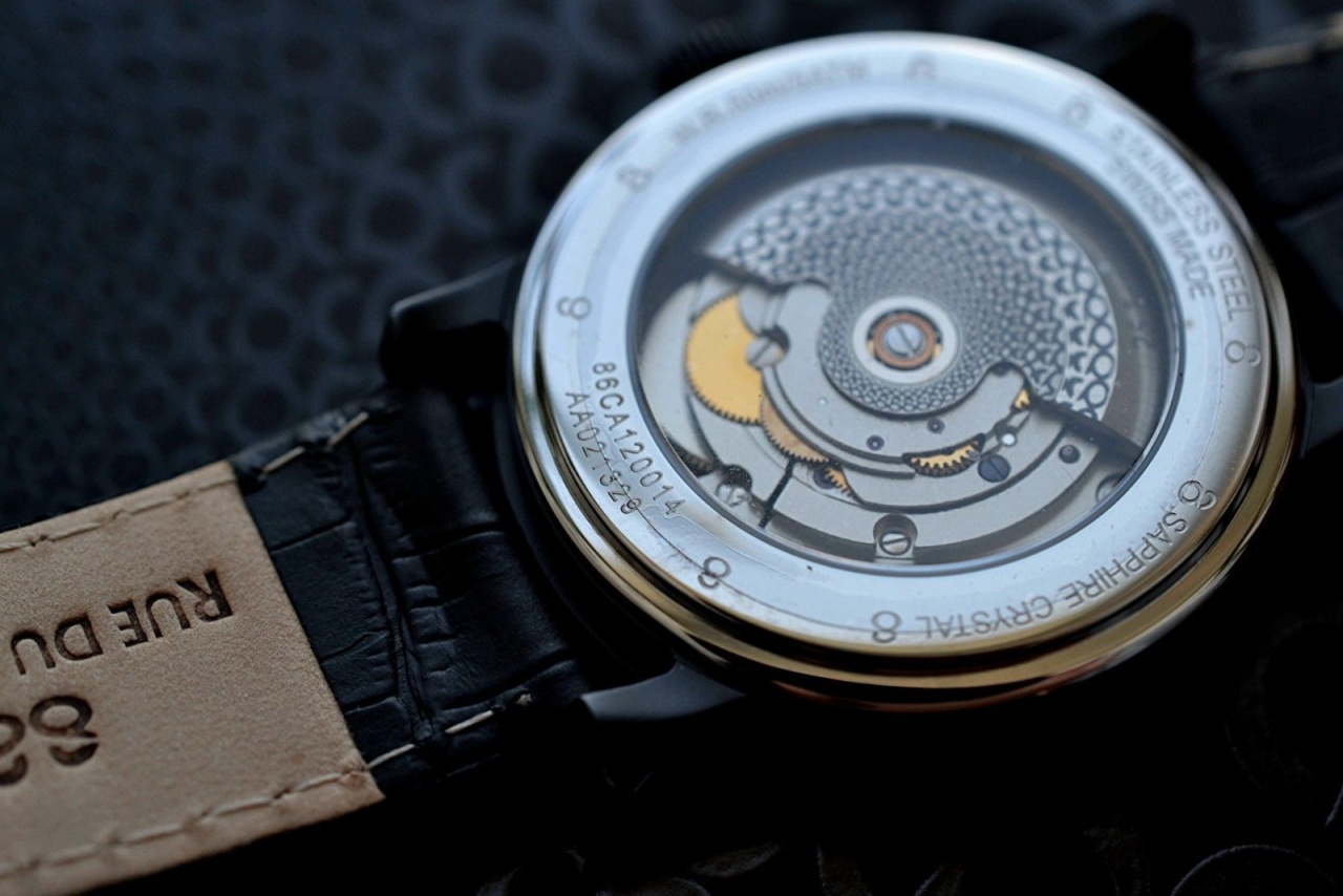Корпус из стали с черным PVD покрытием. Диаметр корпуса - 39 мм, вес меньше 100г. Задняя крышка прозрачная.