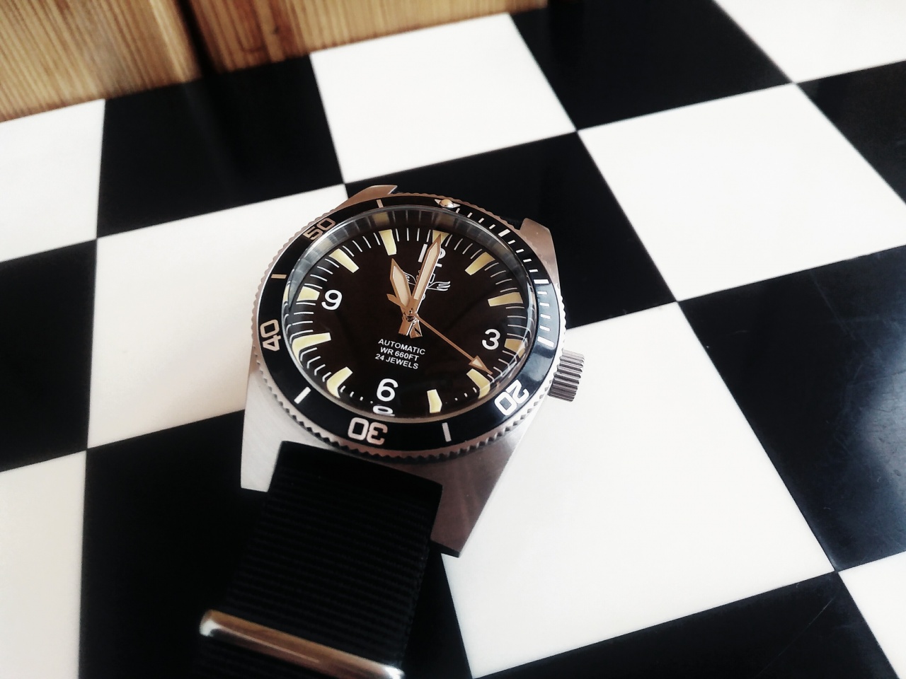 Краткое отступление- мне нравятся часы в дайверском исполнении, да еще и в стиле «ретро». К сожалению, не очень большой выбор таких моделей присутствует на рынке. Ярким представителем таковых является Сеика 62mas и ее хомажи. Но у самой Сеики высоковата цена, а ее хомажи (напр. Сан Мартин )- очень уж «хомажистые»- на грани приличия. Да и часовые метки в виде прямоугольников мне не очень нравятся. Арабские цифры, на мой взгляд- интереснее. Поэтому, когда я увидел данную модель, то быстро оплатил её и через две недели получил, предварительно оплатив 30% таможни, т.к. продавец отказался изменить цену. Часы пришли из Англии с пометкой в таможенной декларации, что страна производства- Швейцария.