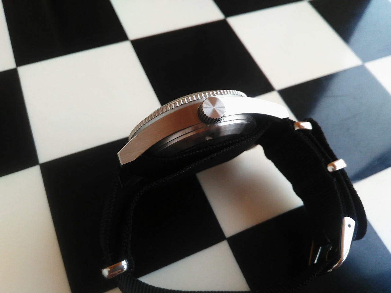 Сами часы имеют размеры 40х44х51х15 мм. Ширина ремешка- 20мм. Корпус стальной сатинированный. Я с помощью лупы просмотрел пространство между ушек и не обнаружил никаких недочетов- все сделано ровно и качественно, как и по всей поверхности. Пространство между ушками прямоугольное. Это очень удобно, т.к. позволяет легко экспериментировать с любыми ремешками и множеством браслетов с прямыми крайними звеньями. Выглядеть они будут лучше, чем на круглом корпусе. Корпус имеет острые грани, но это не приносит дискомфорта. Головка на резьбе и завинчивается легко. В отличии от некоторых других часов, здесь нет необходимости вращать её в разные стороны, чтобы нащупать резьбу.