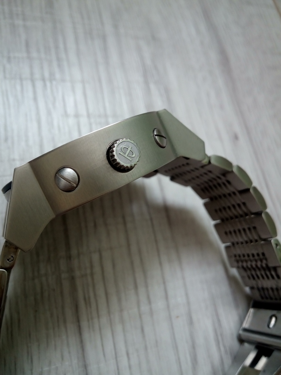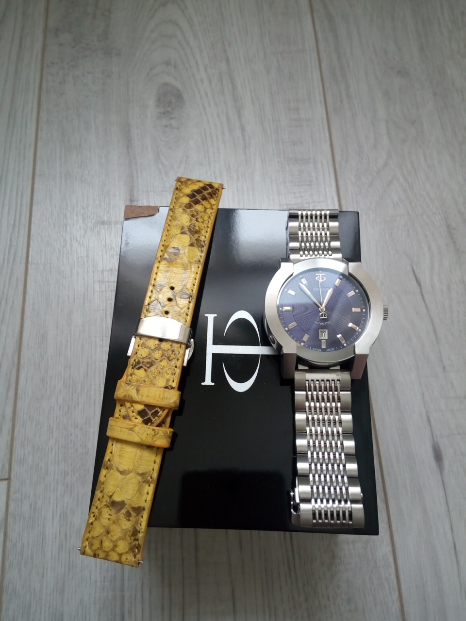 Браслет: на 22мм, не родной, т.к. родной не лучшего качества был, этот намного круче и лучше подходит к часам, на руку примерно 18,5 см, есть три снятых звена. Также в комплекте купленный к этим часам ремень из кожи питона (на фото) с застежкой бабочкой, новый, опять же крайне подходит к данному циферблату, если хочется повеселее