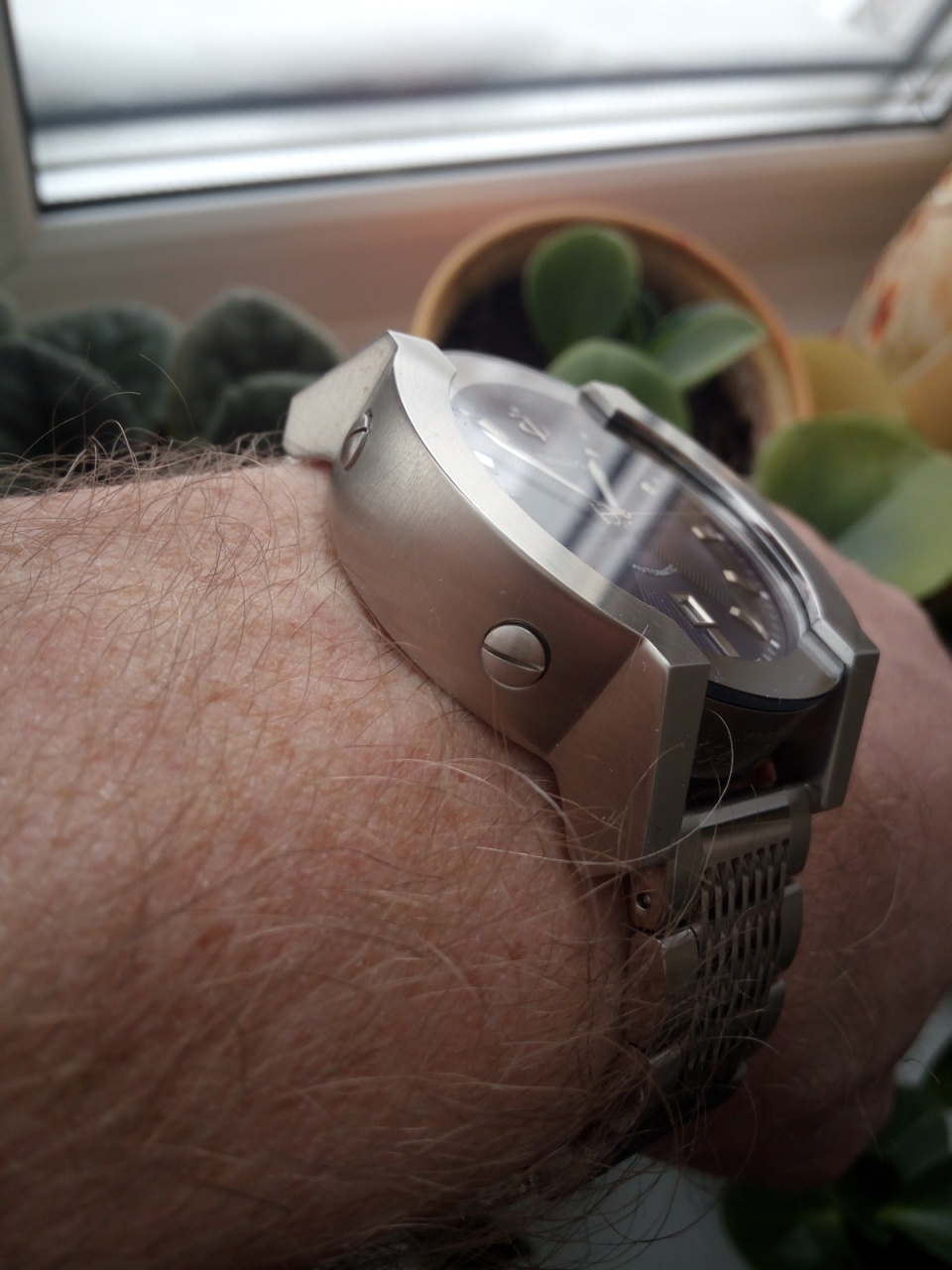 Патентованная форма корпуса, две скобы по бокам на винтах держат корпус и прижимают стекла, соответственоо безеля как такового нет Смотрится очень интересно и необычно, надеюсь фото это передало.