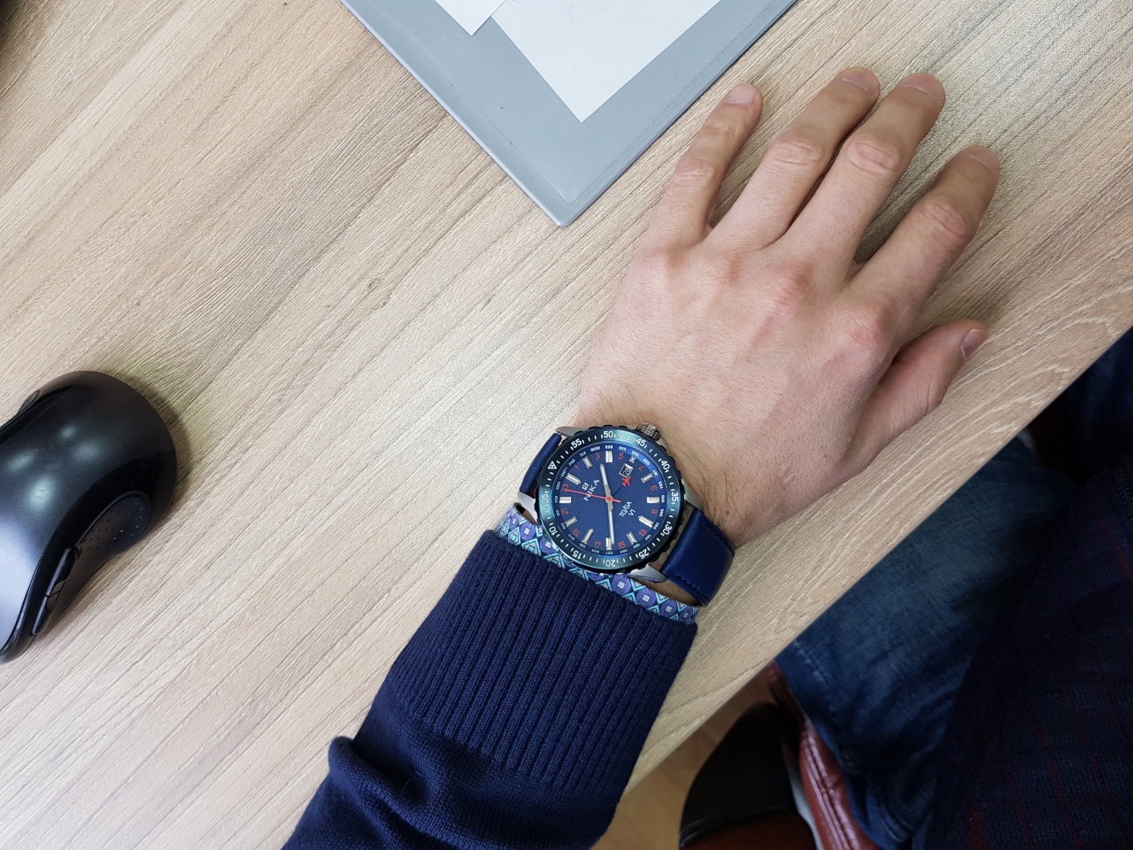 Часы не массивные, в меру лёгкие, кисть не устаёт. Базель сделан неплохо, синий приятный цвет. Единственное положение где он встаёт ровно 6 часов. Очень понравился циферблат, удачное решение, на мой взгляд, с фактурой - матовый, скорее как шагрень, не бликует. Самолётик забавный, отмеряет часовые пояса, напротив каждого часового пояса указан аэропорт, соответствующий данному поясу. Кое-где буквы криво нарисованы, мелочь.