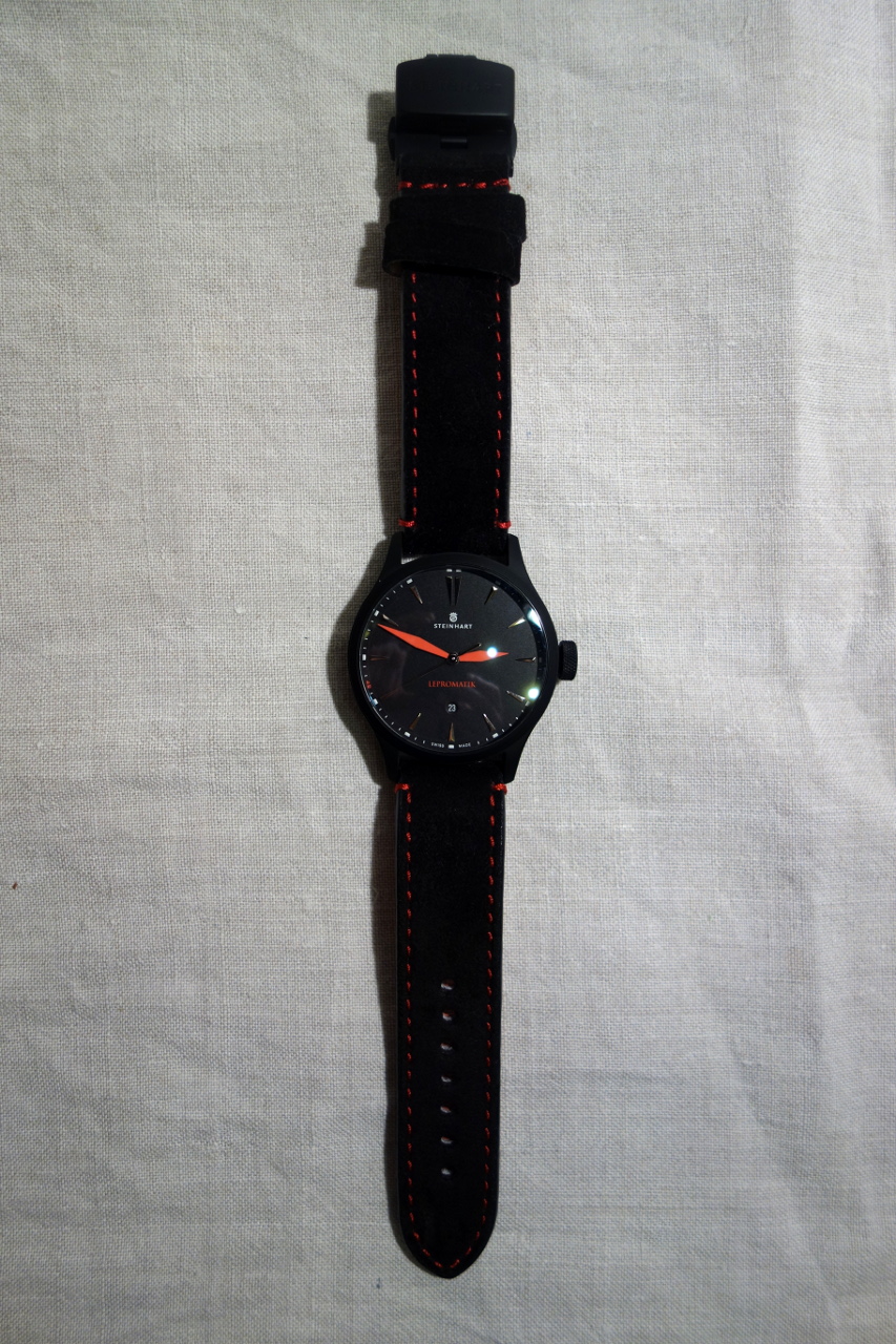 Ремешок: 22х22, чёрный замшевый (с красной подкладкой), дополнительный чёрный кожаный (с красной подкладкой).