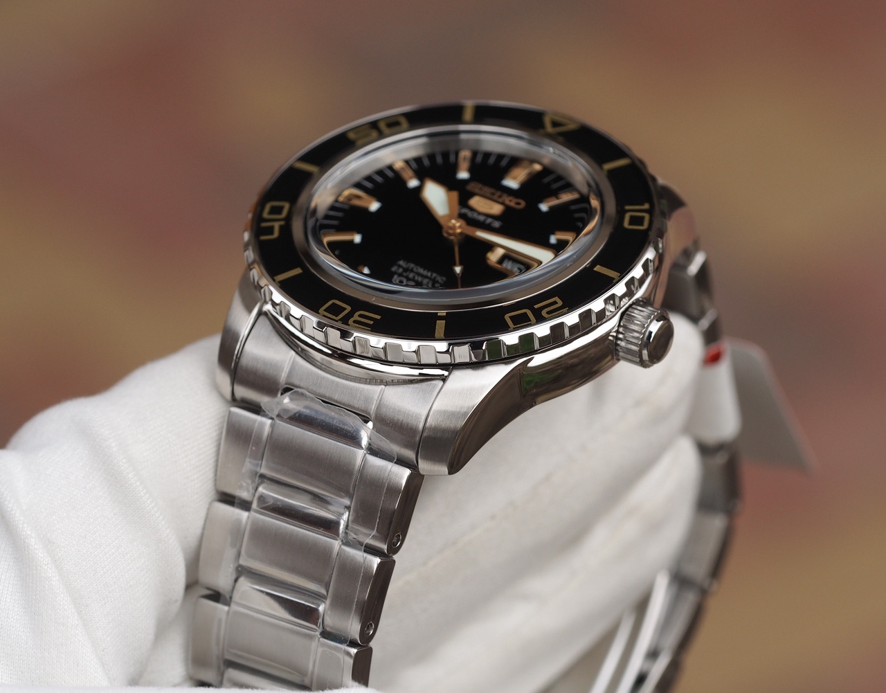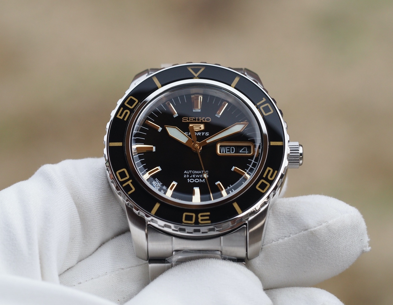 Черный циферблат, накладные метки, окантовка даты и лого Seiko 5