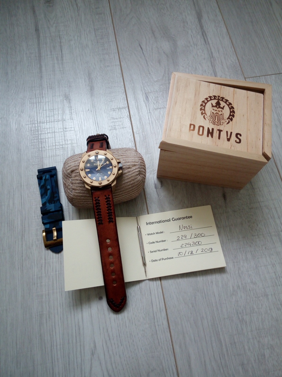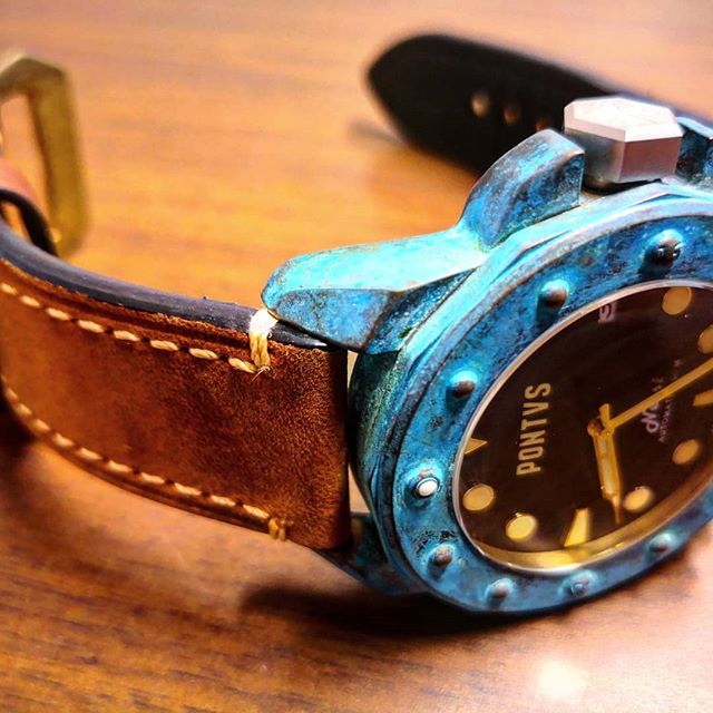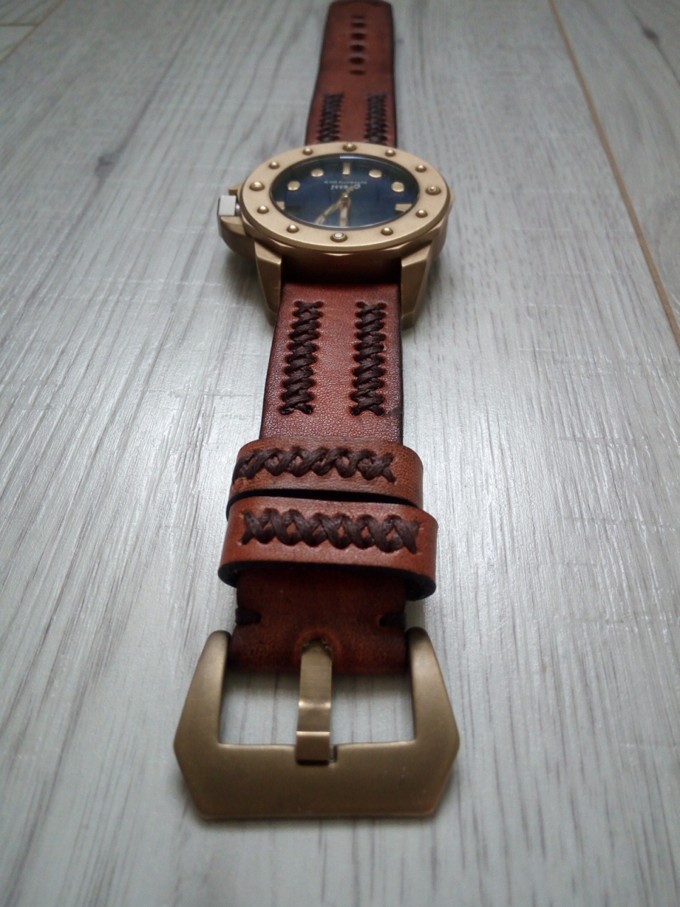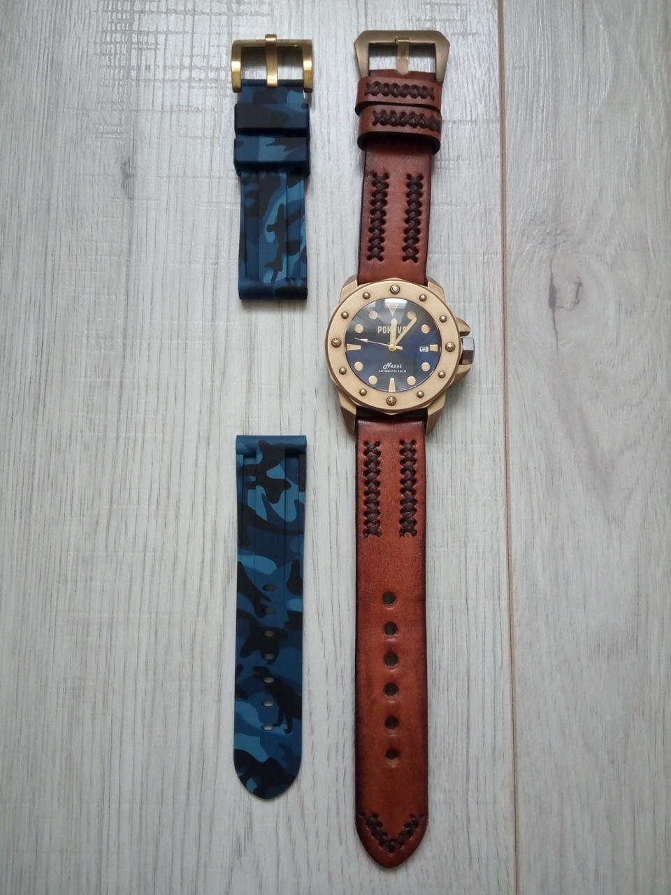 Ремни: 24 мм родные, кожа ручной работы, очень красивый, с латунной баклей и синий каучук с латунной баклей