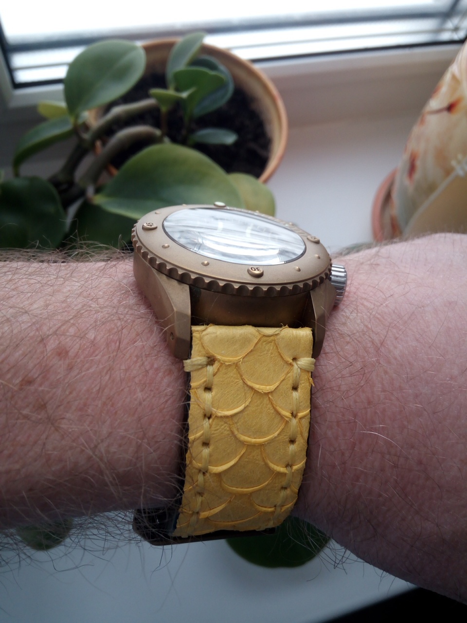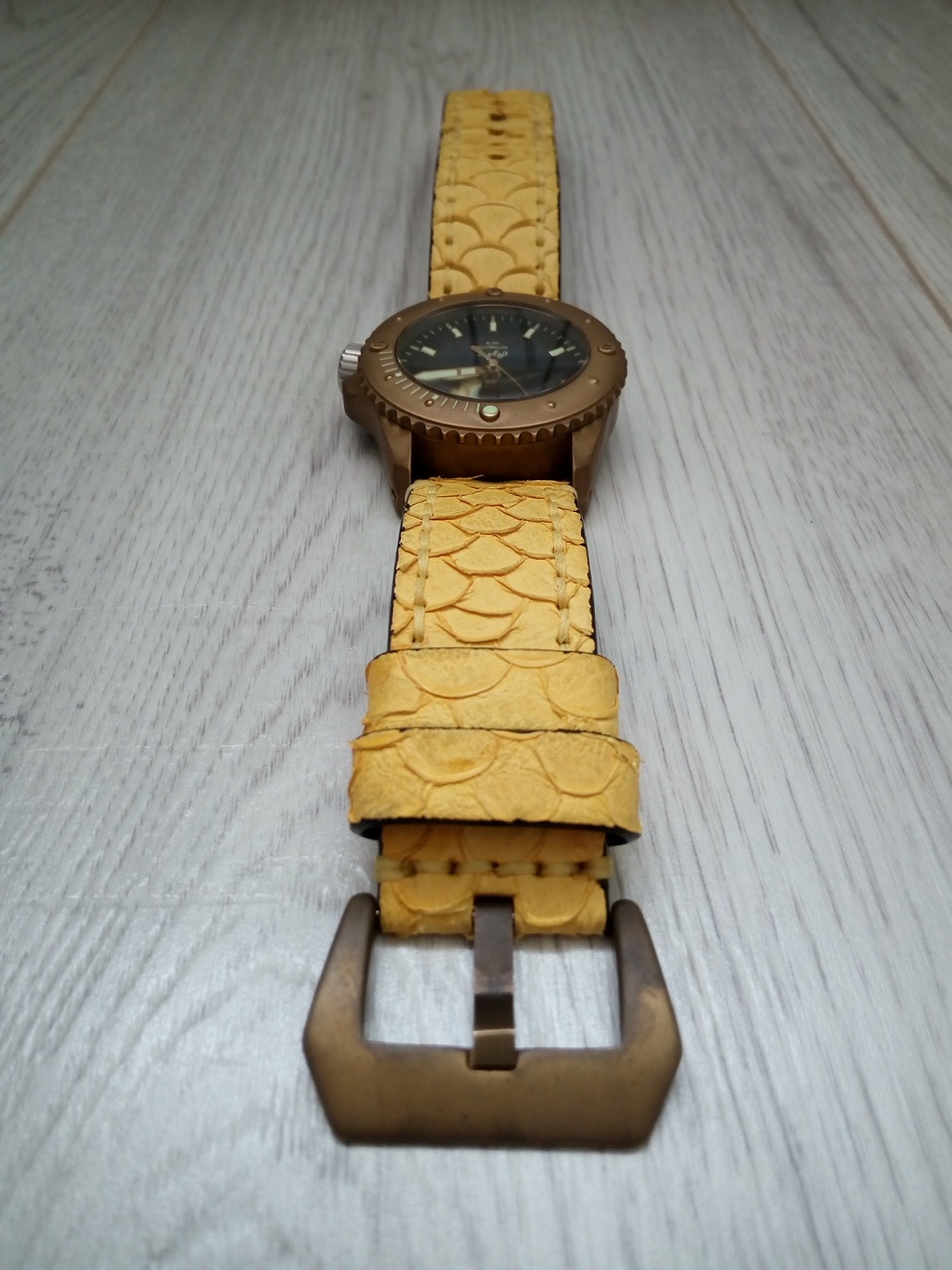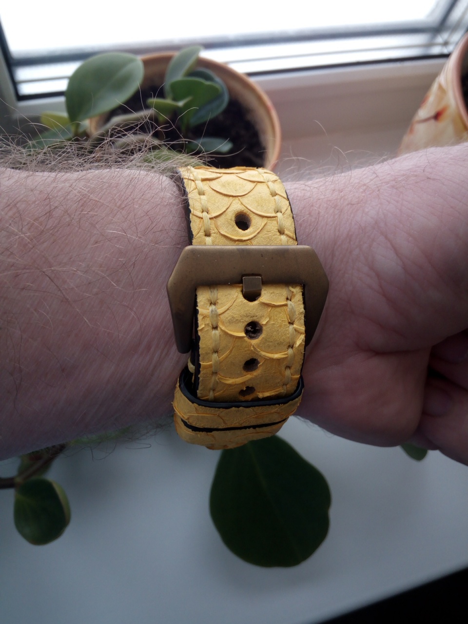 желтый ремень из кожи карпа на фото (дорогой и красивый!)