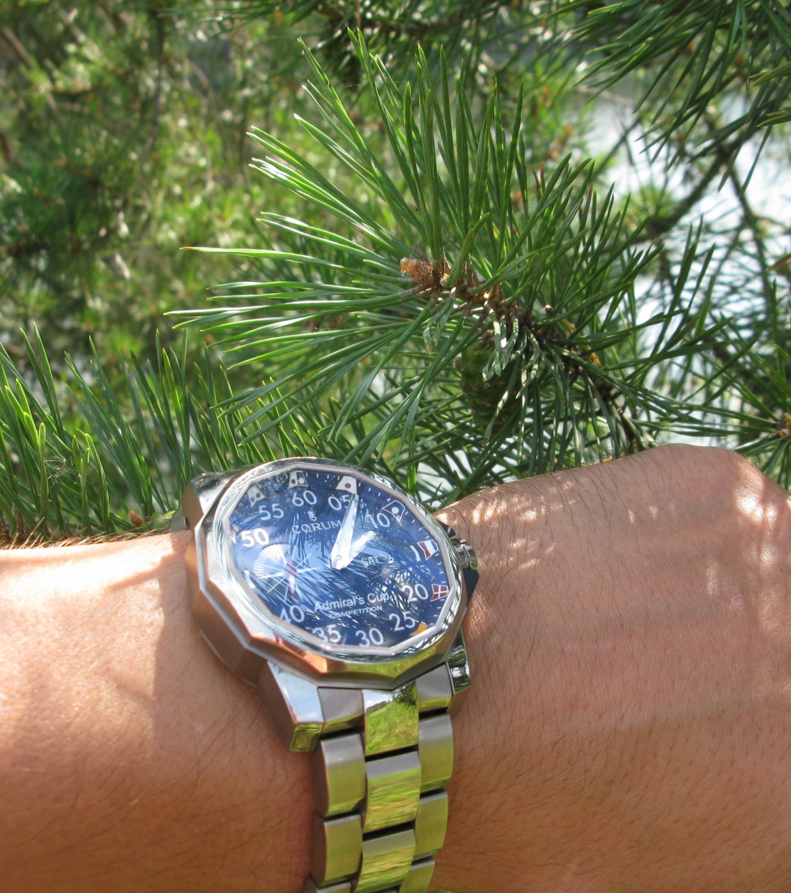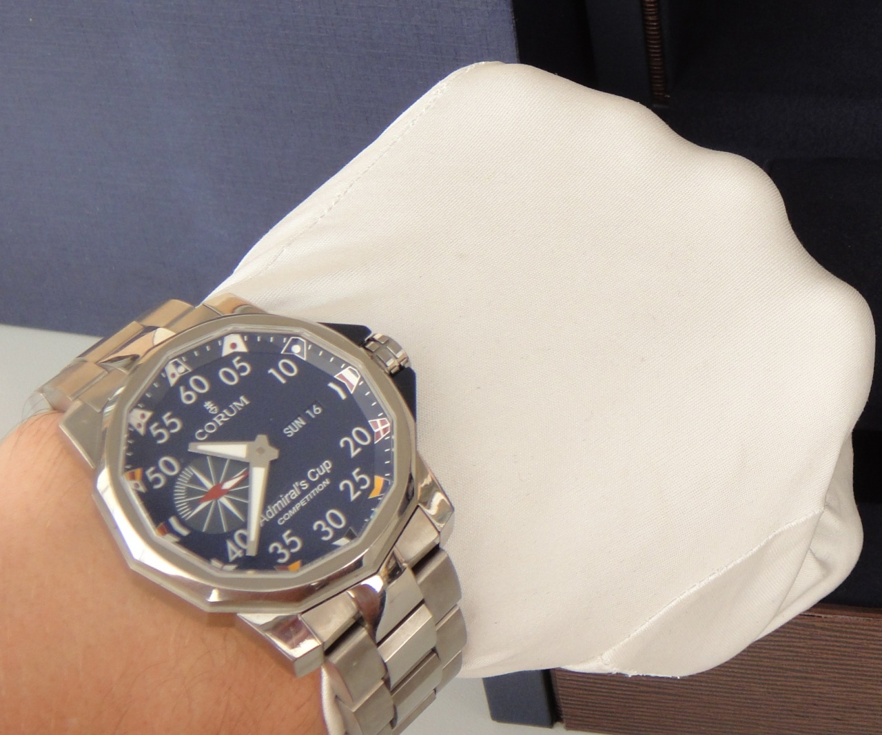 невероятно удачное сочетание синего циферблата с серым цветом матованного титана и сверкающими полированными звеньями браслета - этот ШЕДЕВР надо обязательно видеть и примерять вживую!