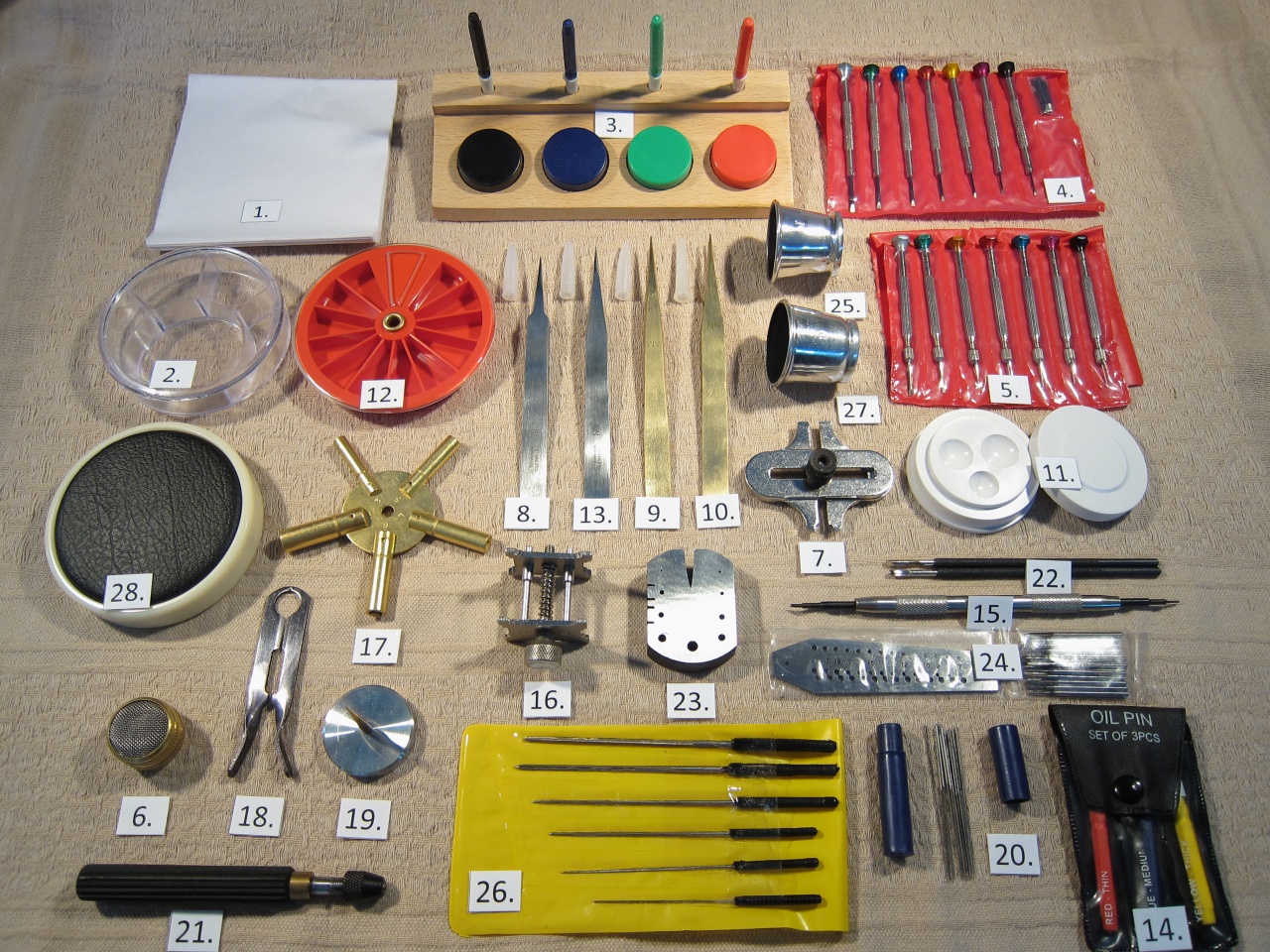 Разные часовые инструменты: пинцеты, отвертки, лупы, подставка для механизма, колизвары, расходники