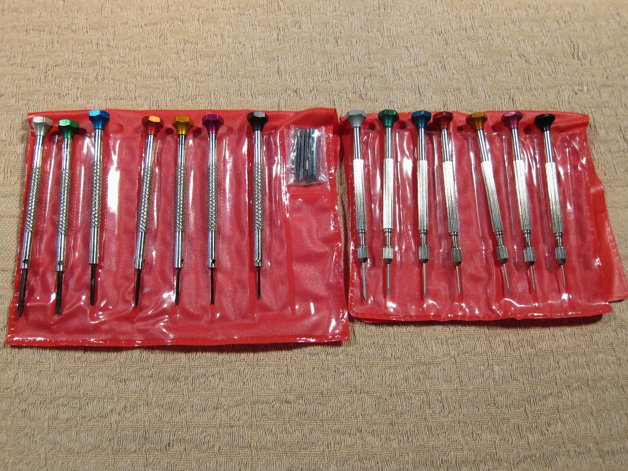 5. Набор часовых цанговых отверток 7 шт. - 500 р. (в наличие - 1 шт.) Диаметры жал - 1.4, 1.2, 0.9, 0.8, 0.8, 0.7, 0.6 мм. Рукоятки сделаны из никелированной латуни, пятки из алюминиевого сплава. В наборе 7 шт. отверток с чехлом.