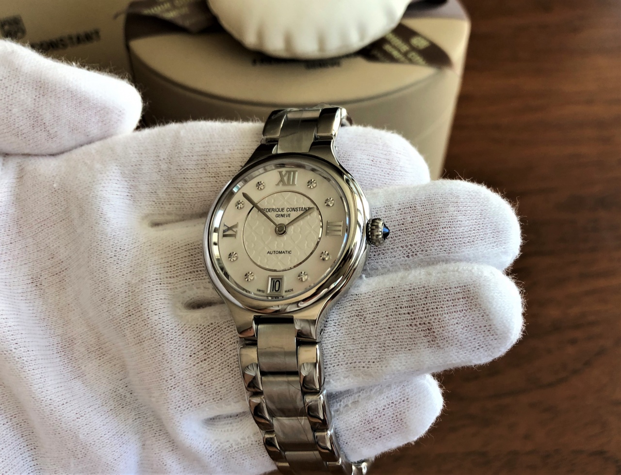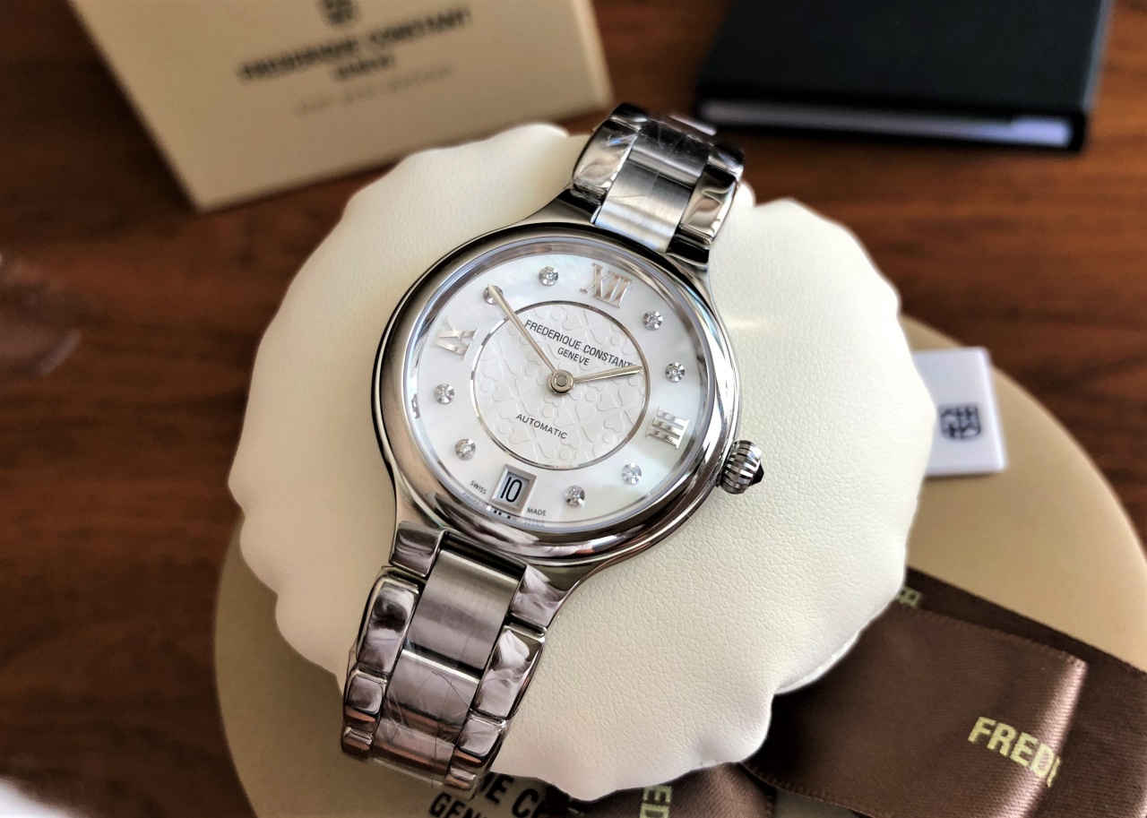 Украшены 8 бриллиантами, диаметр часов 33мм, механика с автоподзаводом, перламутровый циферблат с гильоше, сапфировое стекло.