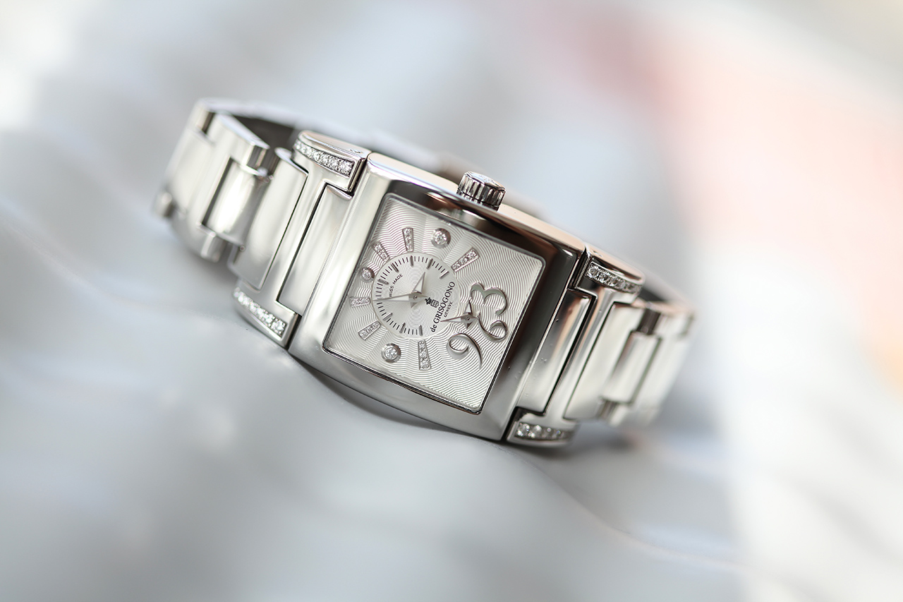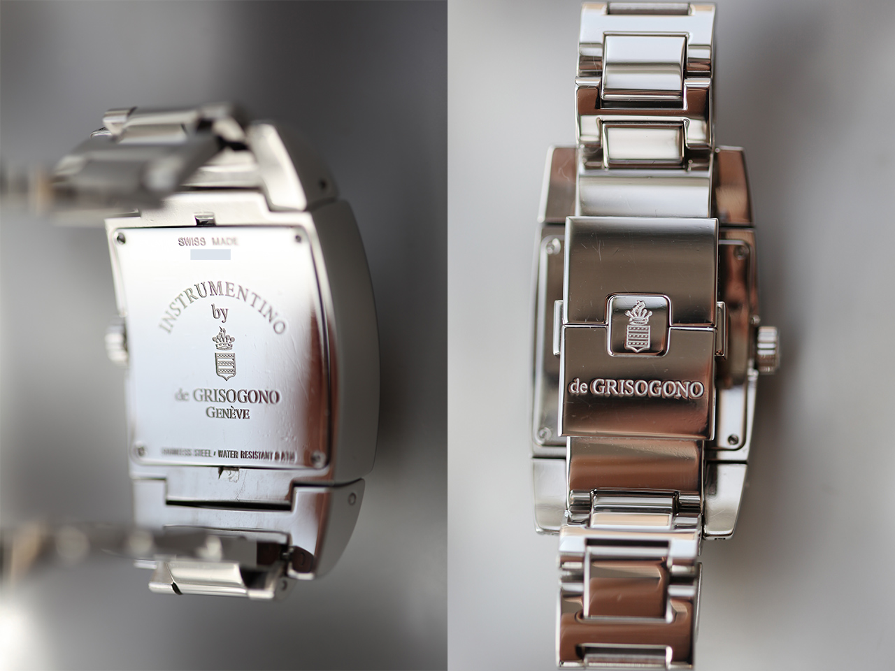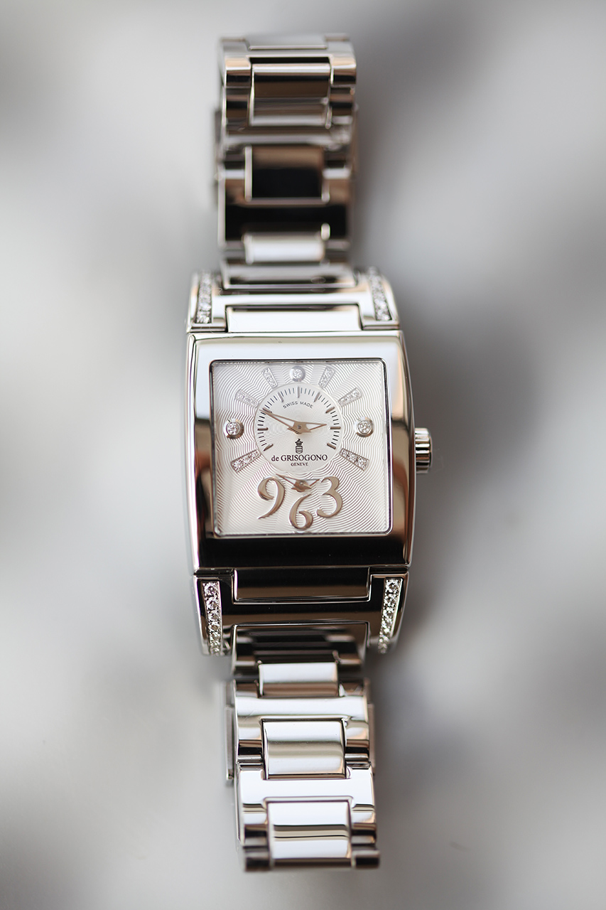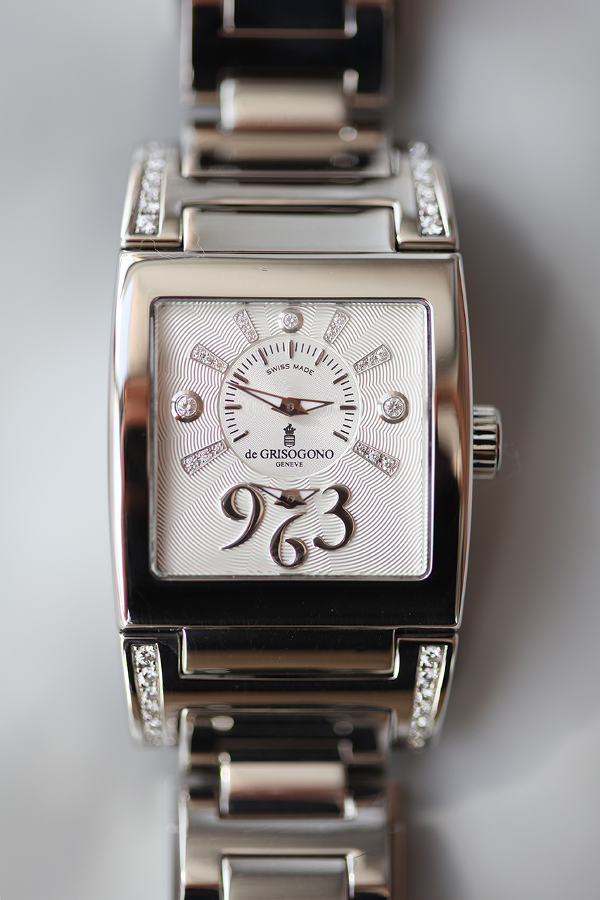 В продаже кварцевый De Grisogono Instrumentino с функцией второго часового пояса. Часы после освежающей полировки. Ушки и циферблат украшены бриллиантами.