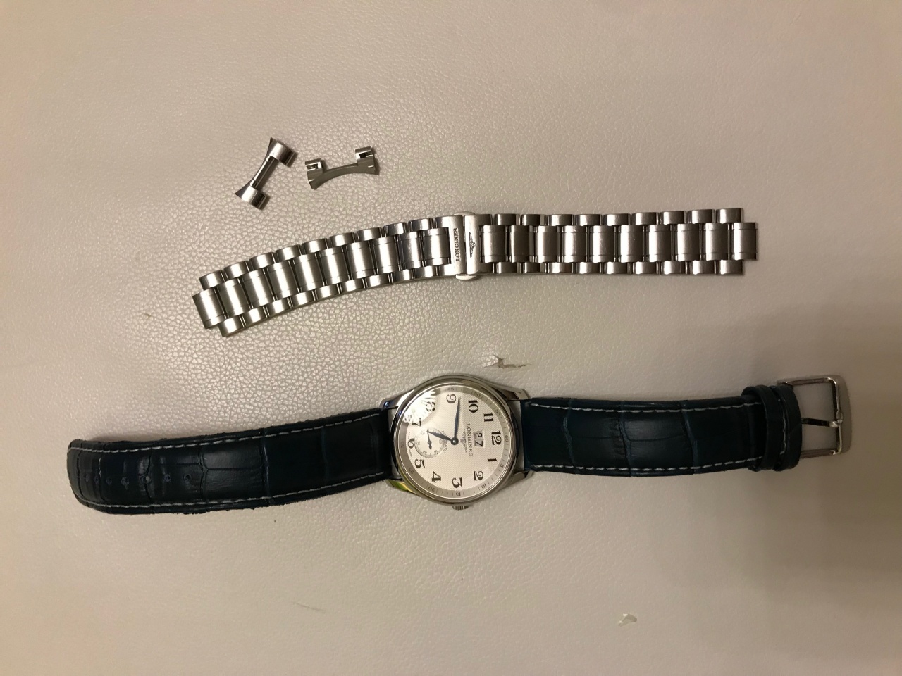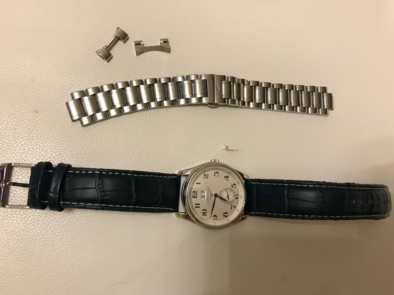 Есть родной браслет, со следами ношения на изнанке и синий кожаный не родной ремешок (в тон стрелкам) с купленной на ебее фирменной пряжкой.