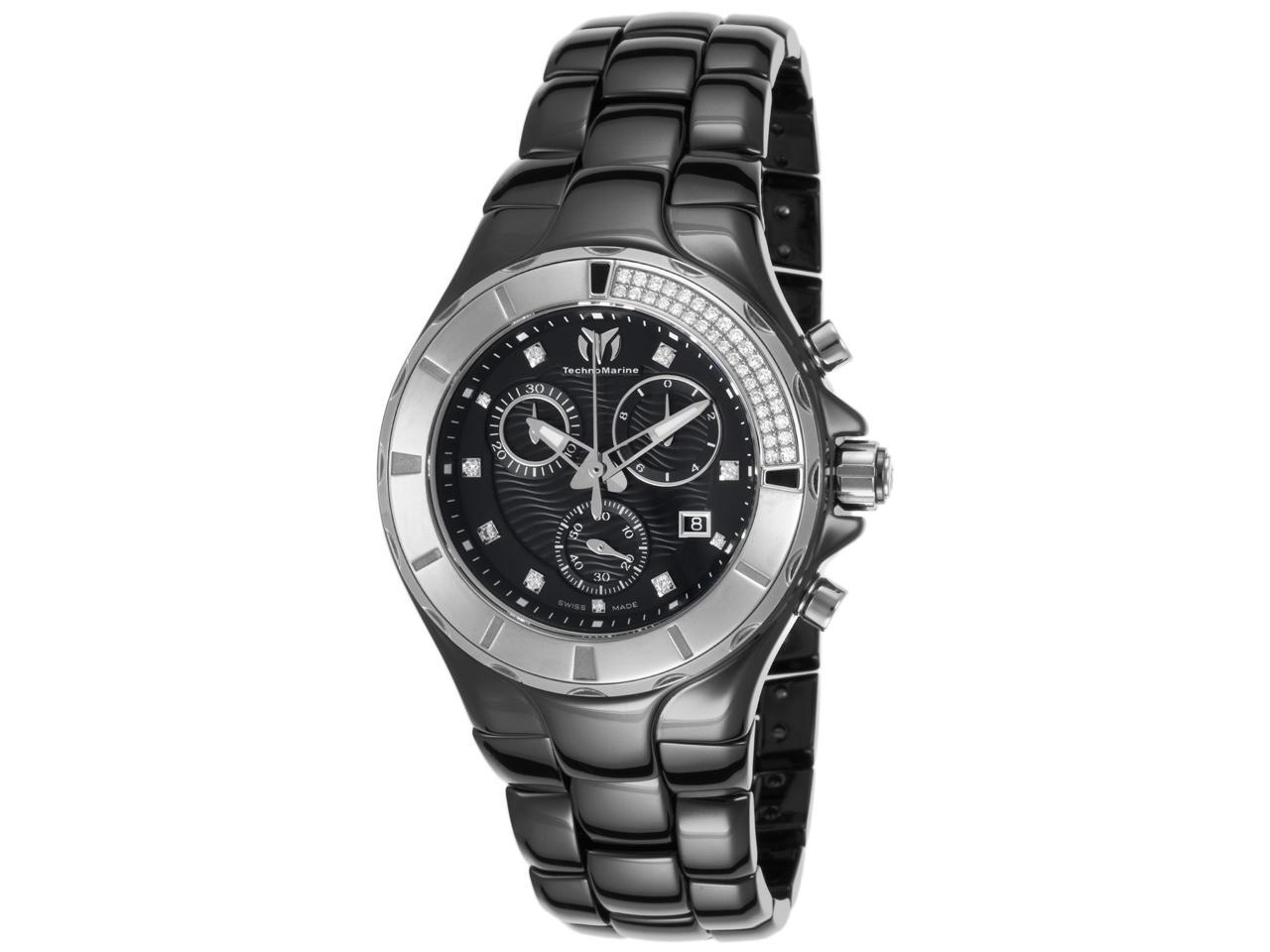 Механизм ETA G15.211. Кварцевый хронограф с секундомером. Индикация числа. Безель инкрустирован 34 бриллиантами 0,22К. Циферблат инкрустирован 10 бриллиантами 0,1К. Браслет из высокотехнологичной керамики. Диаметр корпуса 40 мм.