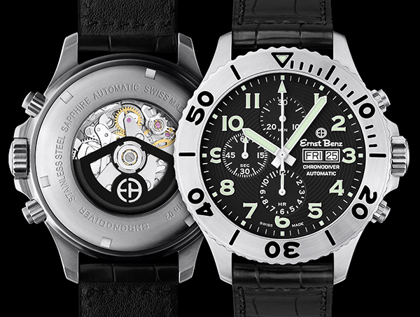 Модель ChronoDiver является одной из знаковых моделей компании Ernst Benz. Она позиционируется в качестве инструмента для дайверов, ее основной задачей является обеспечение точности хода и легкости считывания показателей под водой. Выпускается в четырех вариантах: с классически черным и белым циферблатами с зеленым люминесцентным покрытием на цифрах, индексах и стрелках, а также два новых (с текущего года) - с синим циферблатом с белым люминесцентным покрытием и с черным циферблатом с оранжевым люминесцентным покрытием.