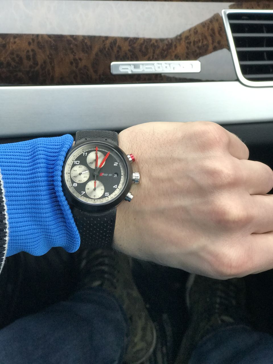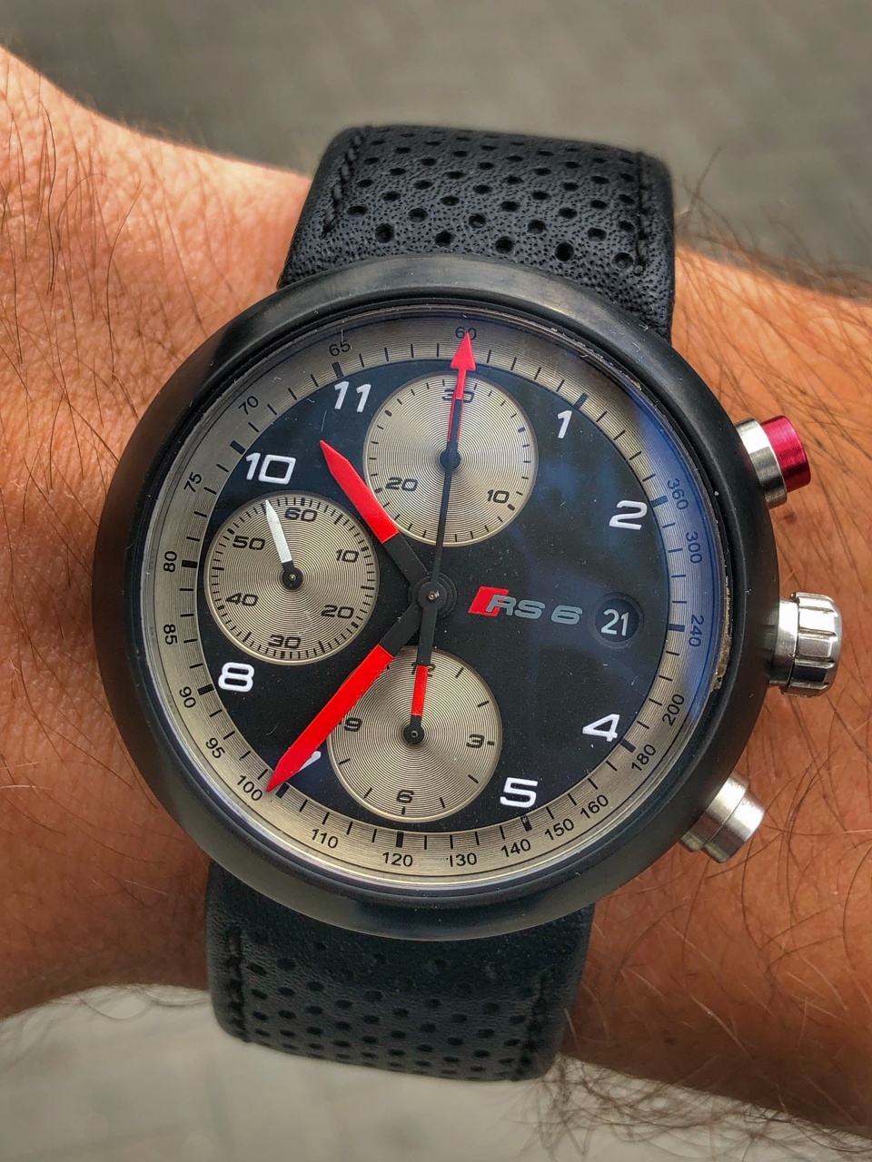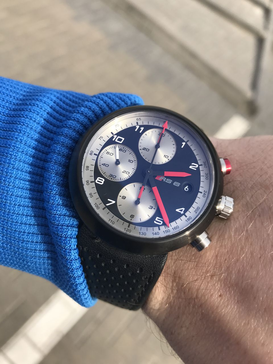 На циферблате, выполненном в фирменном стиле RS 6, имеются минутная стрелка, секундомер и окошко даты.