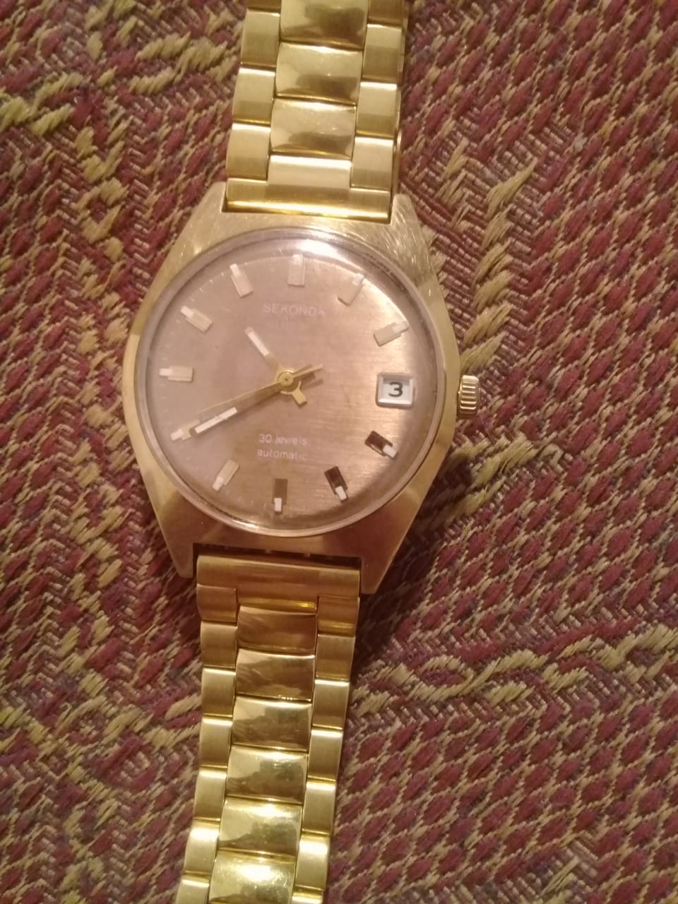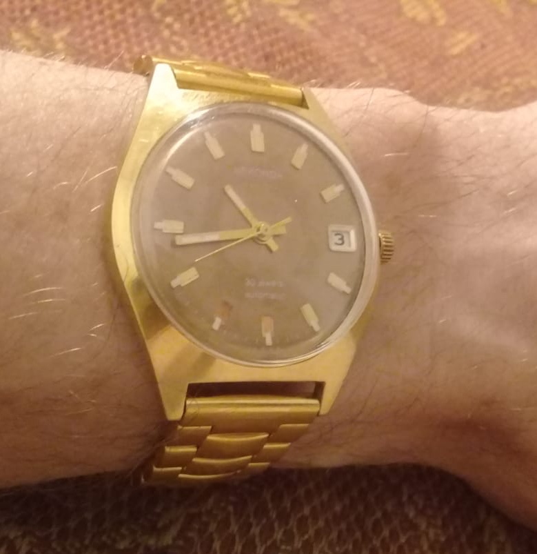 Отличный сохран, позолота на месте, только пара точек у ЗГ, остальная площадь корпуса без дефектов позолоты!!! Стрелки и метки - в идеале! Редкий и красивый цифер, я первый раз такой вижу. Родной браслет Полёт - отлично подходит к этим часам, короче, вид - БОМБА!!! Только стекло похоже, что не родное, но вид и впечатление не портит, потому что, БЛЕСК ОТ ЧАСОВ ОСЛЕПЛЯЕТ