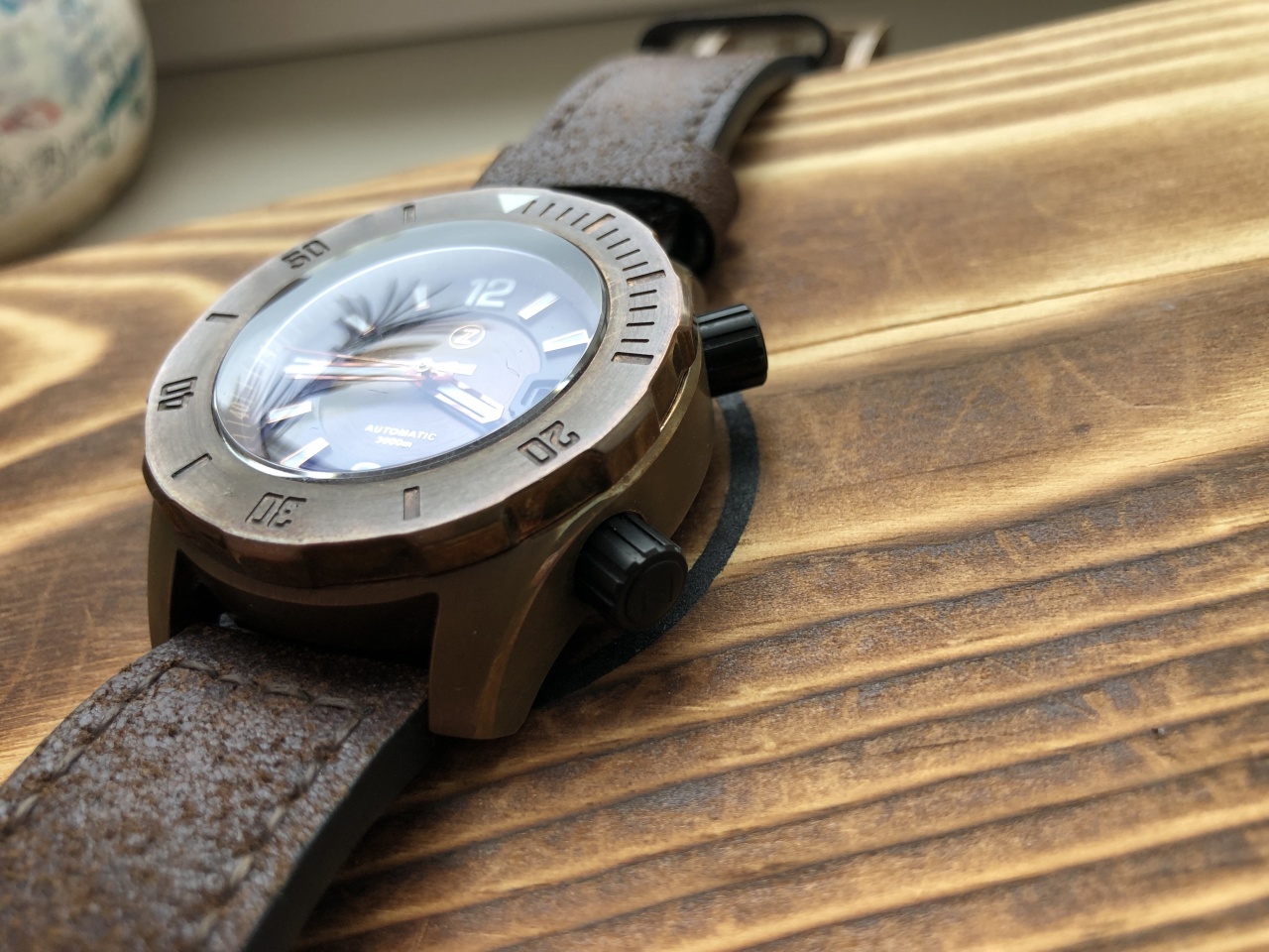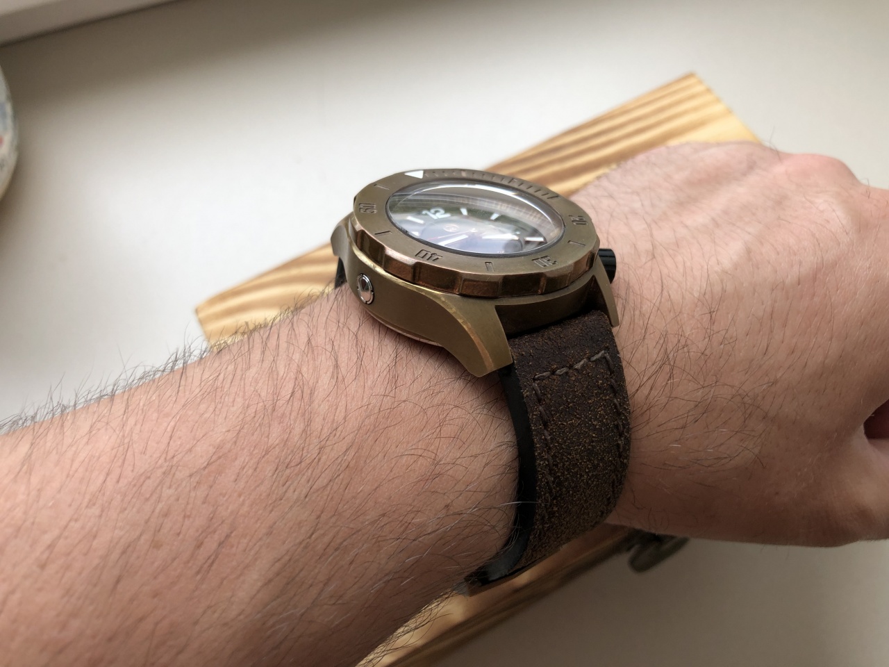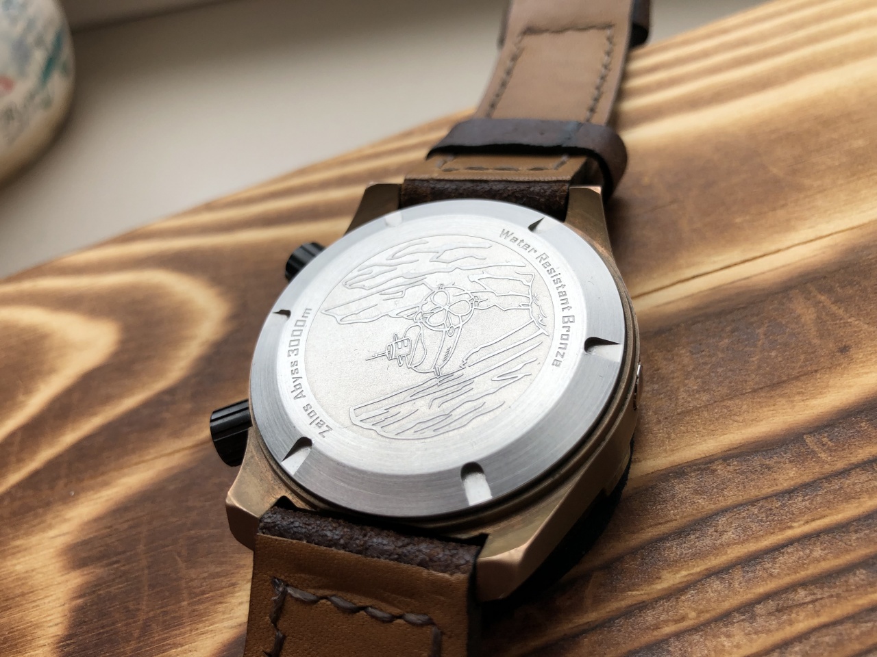Носил и использовал не часто, тк имеются несколько бронзовиков. Исключительно в городе. Повреждений, царапин часы не имеют. За это время покрылись приятной благородной патиной. Мной не вскрывались. Сзади на крышке есть следы, но это от сборки. От времени имеются еле заметные царапки на задней крышке, заметны под определенным углом.