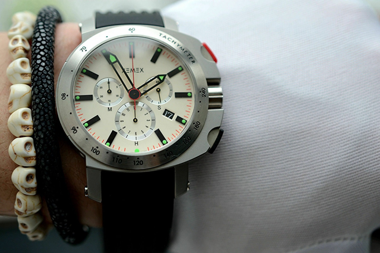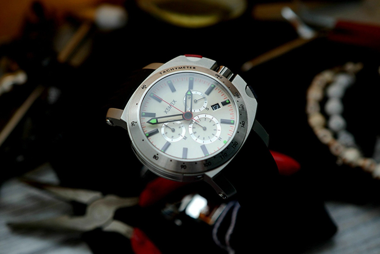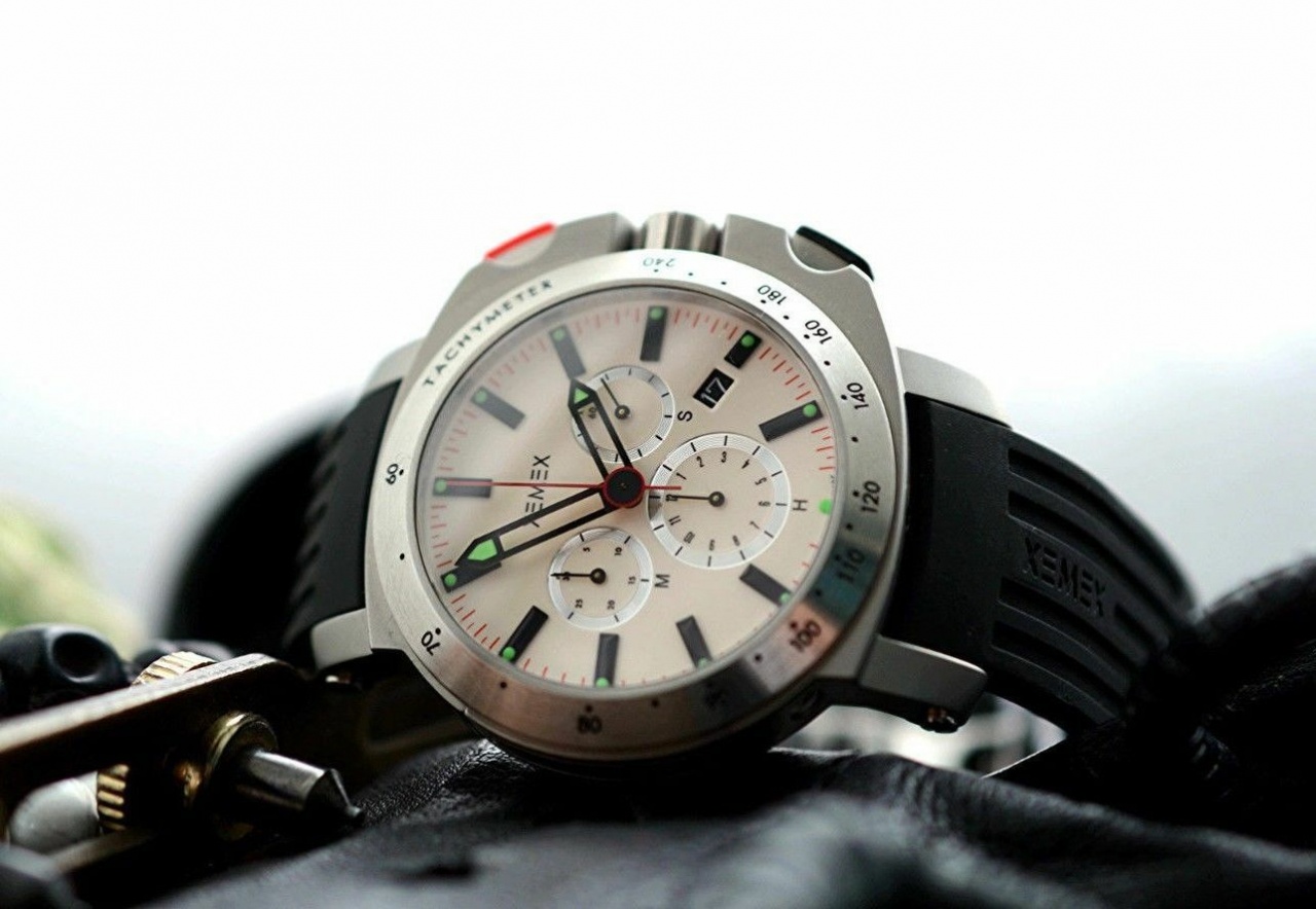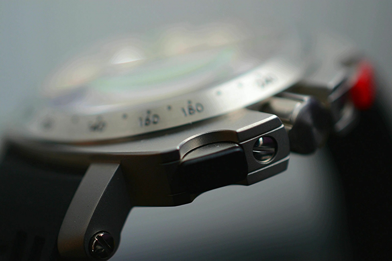 Кнопки хронографа крупные, функции хронографа - секунды, минуты и часы, ADD и SPLIT. Окно даты на "4 часа".