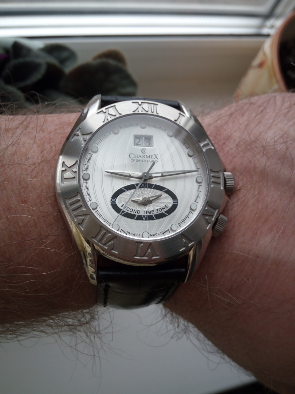 Вторая часовая зона на отдельном циферблате, гравированный безель, солидный мужской размер, отличная отделка корпуса. Часы в хорошем состоянии, стекло чистое, по корпусу минимум следов эксплуатации, на задней крышке - пленка.