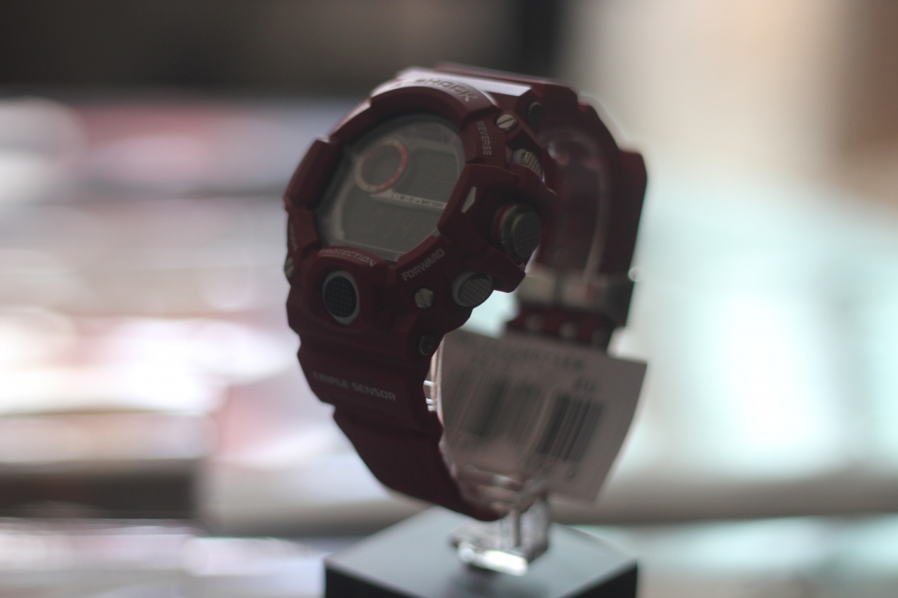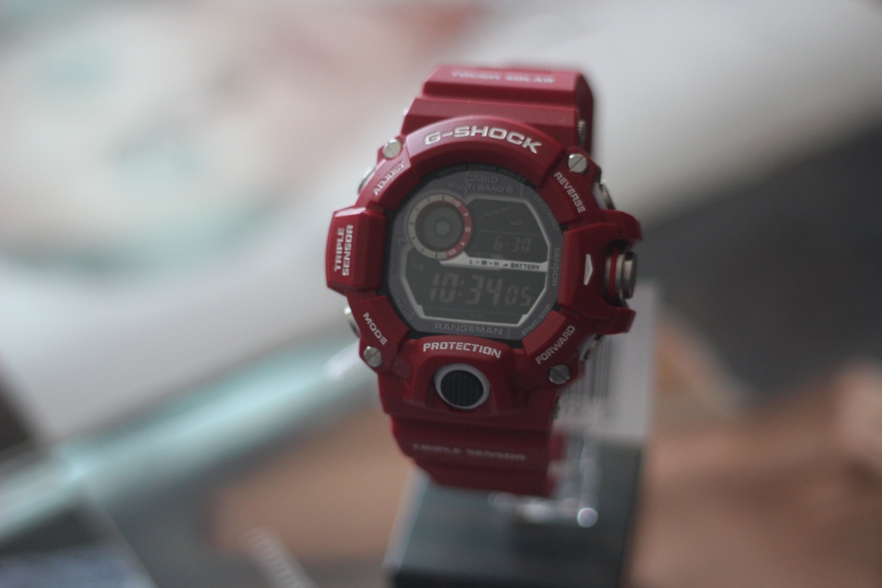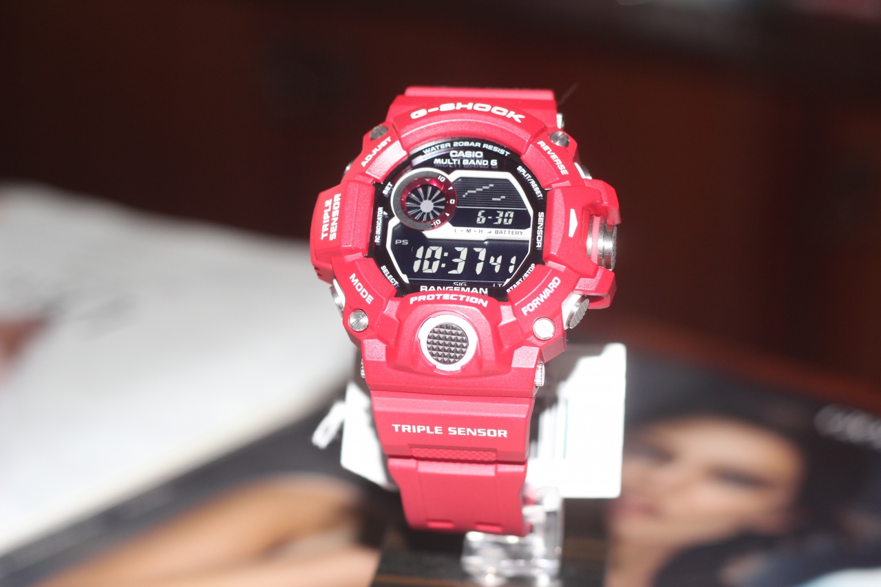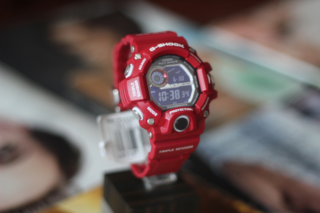 G-Shock Rangeman. Питание от солнечной энергии. Индикатор заряда батареи. Календарь. 5 будильников. Светодиодная автоматическая подсветка. Функция автоматического сохранения энергии. Коррекция текущего времени радиосигналом на территории почти всей Европы, США, Японии и Китая. Встроенный цифровой компас. Высотомер - встроенный датчик барометрического давления с возможностью вывода результатов в единицах высоты над уровнем моря (от -700 до 10000 метров). Память данных высотометра до 40 записей. Барометр - измерение атмосферного давления от 260 до 1100 гПа (от 7, 65 до 32,45 мм рт. ст. ). Встроенный датчик температуры от -10 С до +60 С с точностью 0,1 C. Время восхода и захода Солнца. Секундомер с точностью показаний 1/100с и временем измерения 1000ч. Таймер обратного отсчета от 1мин до 24ч. Мировое время. 12-ти и 24-х часовой формат времени. Функция отключения/включения звука. Ударопрочная конструкция защищает механизм от ударов и вибрации. Размер корпуса 53.5x55.2x18.2 мм.