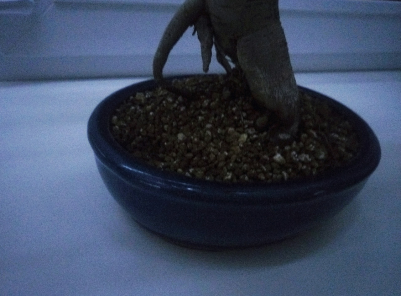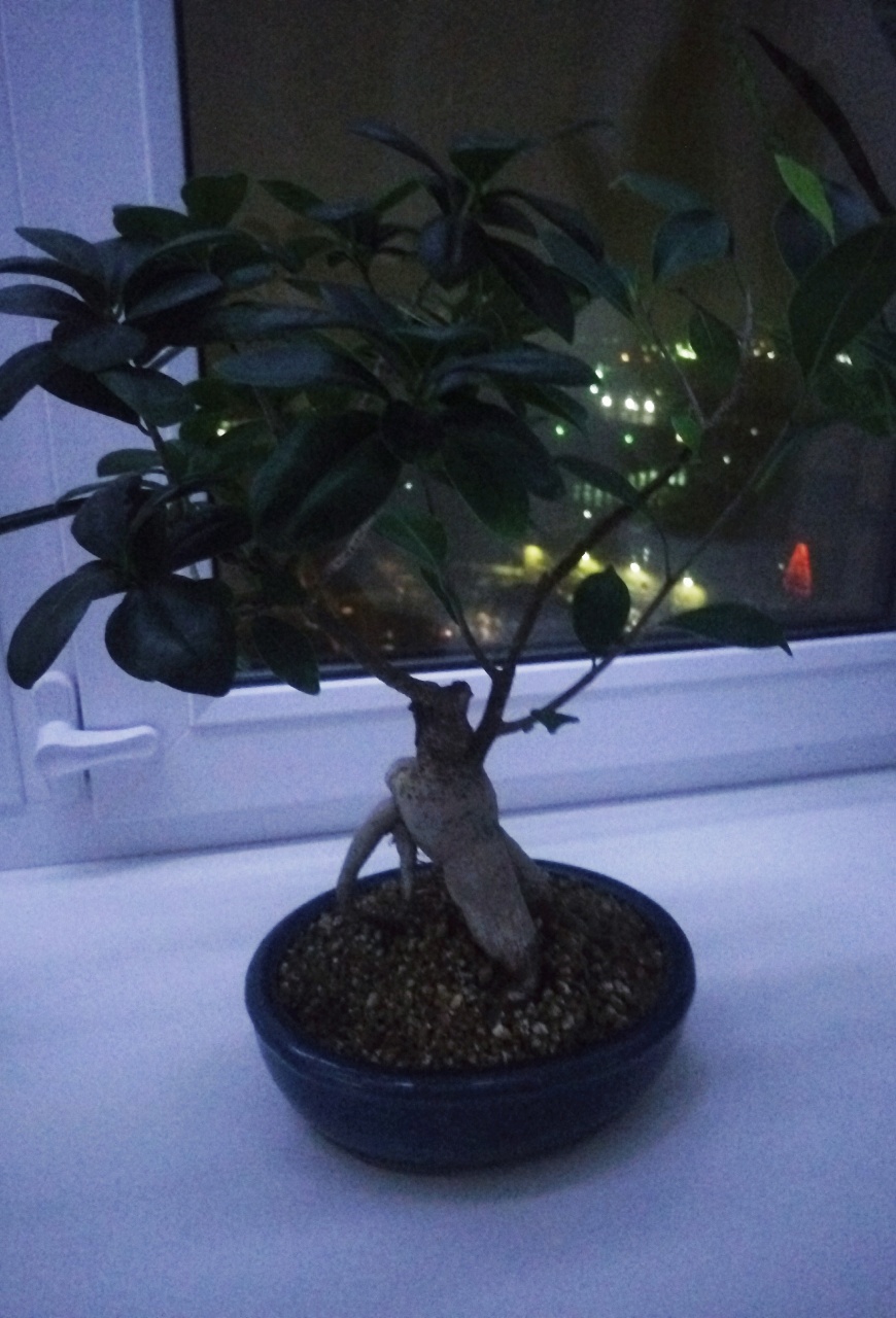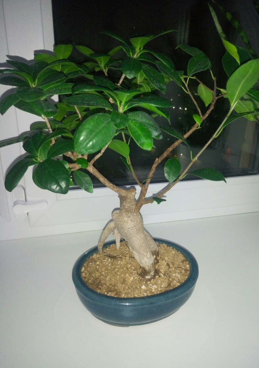 Бонсай из китайского баньяна с мощным каудексом и зеленой кроной. Сидит в японской глине акадаме (обоженная глина для вентиляции, содержит необходимые микроэлементы). В бонсайнице закреплен специальной мягкой проволкой. Дереву уже лет семь , формировал его я сам, в условиях квартиры. Занятие кропотливое, но интерессное, никакого отношения к ботанике из голландии на чудо удобрениях не имеет.