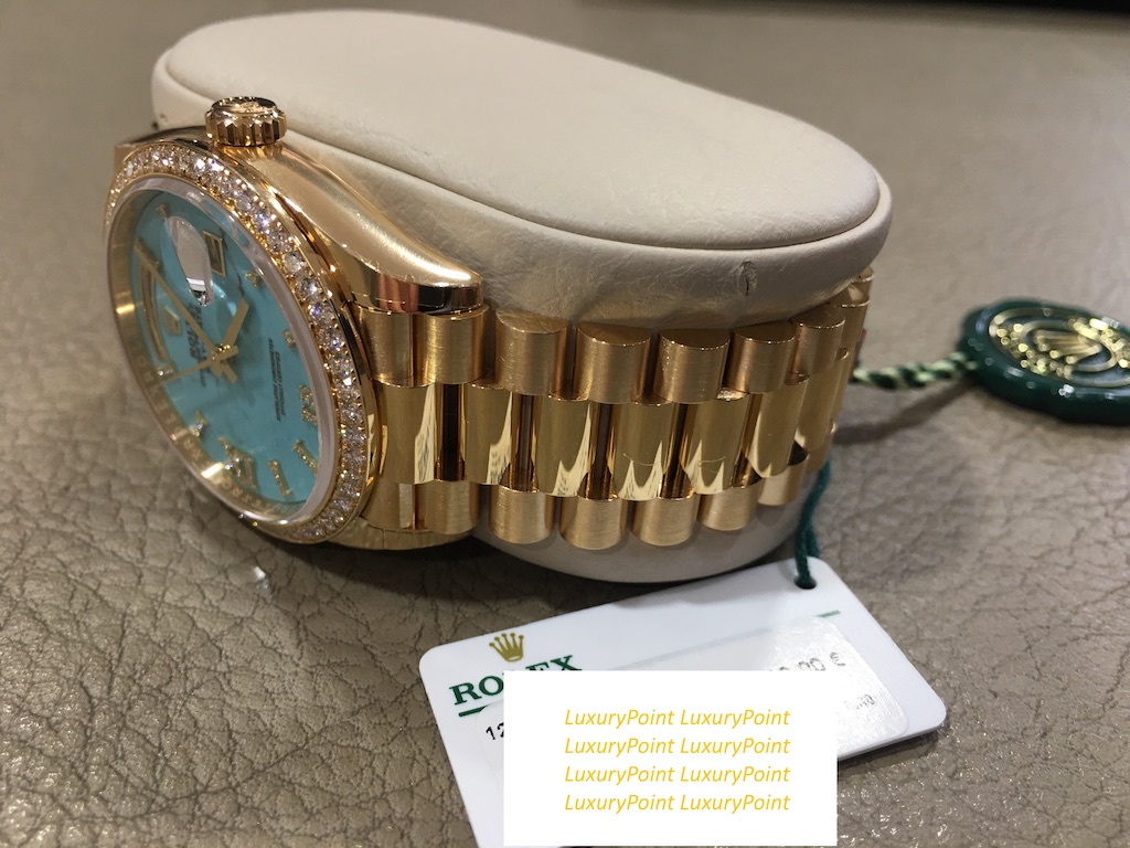 Великолепная возможность стать одним из первых обладателей украшения экспозиции Ролекса на Baselworld 2019 – великолепных ДД 36 из жёлтого золота на браслете Президент с инкрустированным 52 бриллиантами безелем. Изюминкой этих часов является циферблат красивейшего бирюзового цвета с часовыми отметками из 18‑каратного золота, украшенными 32 бриллиантами и римскими цифрами VI и IX из 18‑каратного золота, украшенными 24 бриллиантами. Эта модель будет выпускаться в очень ограниченном количестве и поступит только в магазины самых крупных дилеров бренда.
