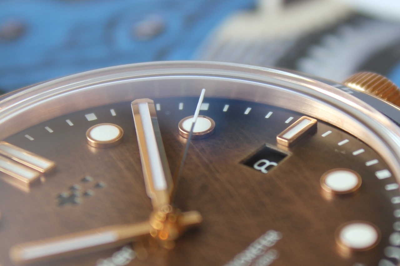 Накладные метки имеют прямоугольную (на отметках 3, 6, 9 и 12 часов) и круглую (на остальных отметках) формы. На 12 часах отметка двойная. Все метки и стрелки имеют зеркальную полировку и позолочены, что хорошо сочетается с цветом бронзы. Сердцевина минутной и часовой стрелок обработана сатинированием Вся эта красота наполнена люмом TC-1 Super-LumiNova.