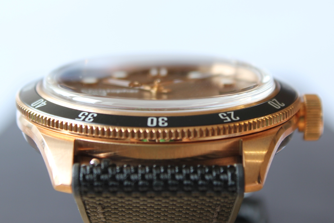 Отдавая должное винтажному стилю вставка безеля изготовлена из анодированного алюминия. Сам безель, вращающийся в одном направлении и имеющий классическую дайверскую разметку, сделан из бронзы. Черный цвет вставки гармонирует с темным краем циферблата и является, так сказать, его «продолжением».