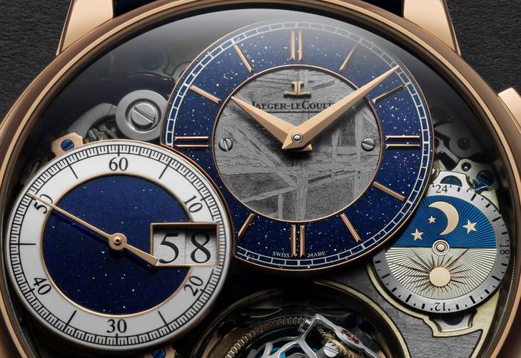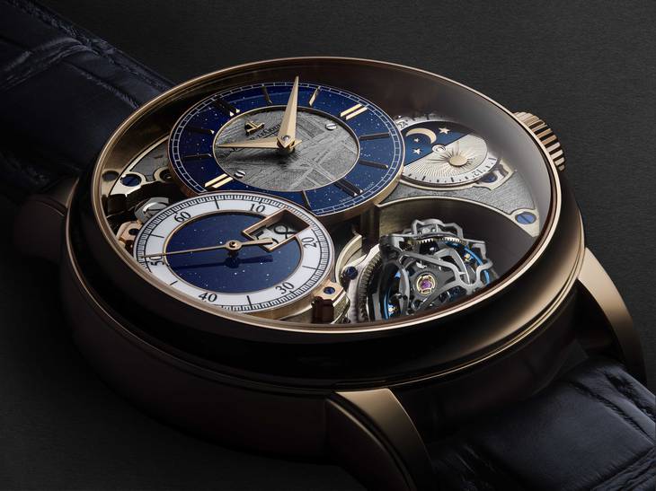 Новая флагманская модель Master Grande Tradition Gyrotourbillon 3, выпущенная лимитированной серией из 8 экземпляров, привычно сочетает фирменный гиротурбийон третьего поколения и хронограф с необычной цифровой индикацией минут. На этот раз, впрочем, изделие декорировано сразу в нескольких традиционных техниках, включая ручное гильоширование, гравировку и горячую эмаль. Корпус диаметром 43,5 мм и детали циферблата выполнены из розового золота. Ряд передних мостов и центральная часть регистра основного времени покрыты узором из метеорита, внешний диаметр последнего также обрамлен темно-синим авантюрином с накладными индексами. Секундный счетчик хронографа в положении «9 часов» оформлен вставкой из авантюрина и белой эмалью с индексами. На нем же расположено окошко, отсчитывающее минуты.