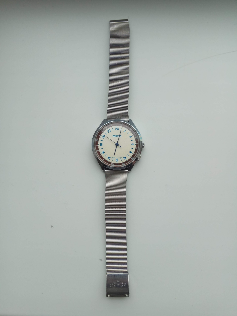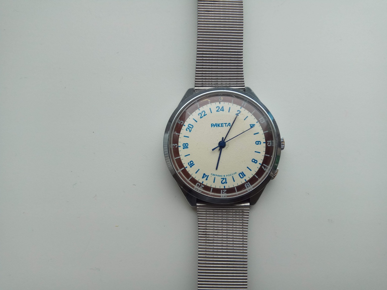 Советские часы производства Петродворцового часового завода. Сделано в начале 90-х. Часы имеют народное название «24 часа» или «Вахтенные». Интересны, прежде всего, тем, что часовая стрелка проходит полный круг по циферблату за 24 часа, а не за 12 часов как у обычных часов. Выпускались для вахтовиков крайнего севера (там, где длинные полярные ночи) и подводников (под водой вообще солнца нет). Для того чтобы легко было понятно время суток - день или ночь. Внешняя шкала с нечетными цифрами вращается вокруг центральной оси при помощи дополнительной головки. Функциональное назначение - выставлять начало смены и отслеживать ее окончание.