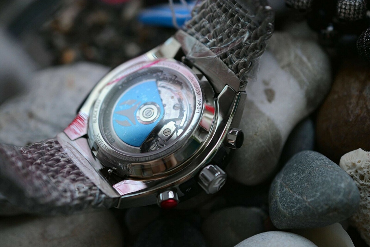 Кнопки хронографа крупные, завинчивающиеся. Функции хронографа - секунды, минуты и часы.
