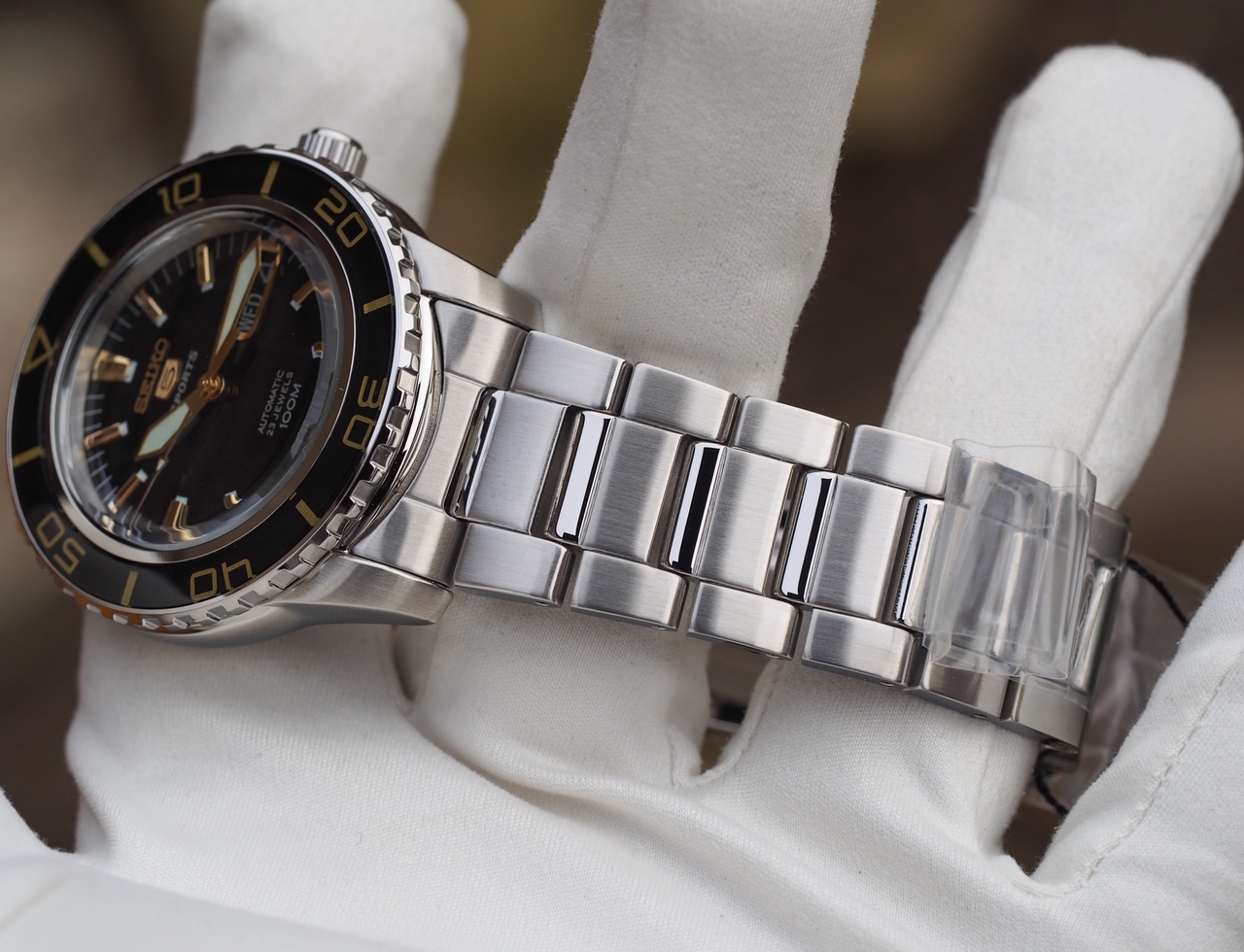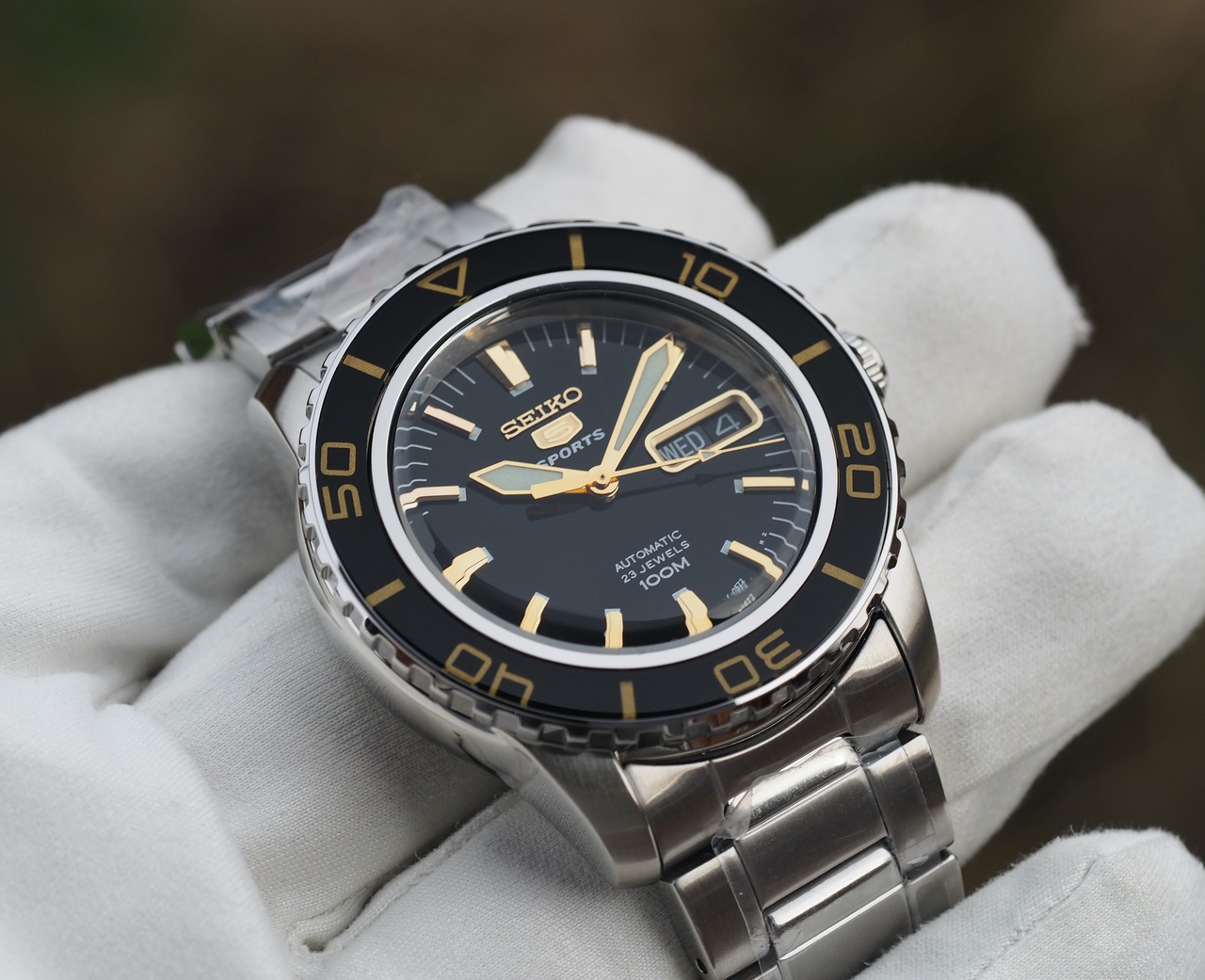 Черный циферблат, накладные метки, окантовка даты и лого Seiko 5