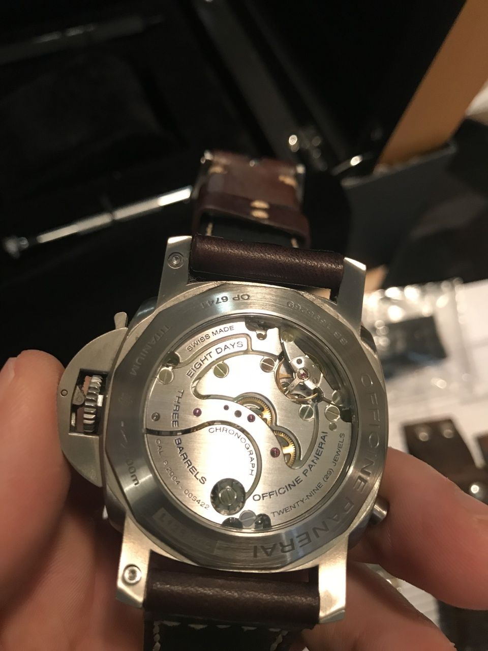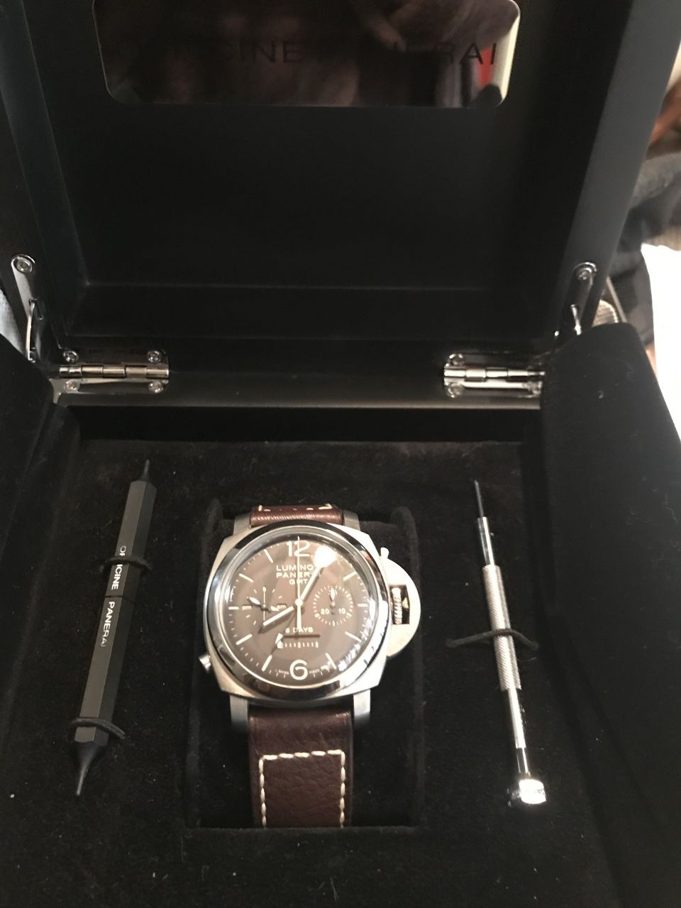 В созданном OFFICINE PANERAI ХРОНОГРАФ LUMINOR 1950 CHRONO MONOPULSANTE 8 DAYS GMT TITANIO – 44 ММ высокотехнологичный эксклюзивный механизм Р.2004 с ручным заводом представлен в стандартном корпусе Luminor 1950 размером 44 мм. Изготовленные из титана часы отличаются выдающимися техническими характеристиками, высокой надежностью и водонепроницаемостью. Модель Luminor 1950 Chrono Monopulsante 8 Days GMT имеет целый ряд поразительных инновационных элементов, таких как: механизм с ручным заводом и восьмидневным запасом хода, линейный индикатор запаса хода, индикация времени второго часового пояса с индикатором дневного/ночного времени суток, обеспечивающая синхронизацию часов с сигналом точного времени система установки секундной стрелки на ноль, однокнопочный хронограф с колонным колесом и фрикционным сцеплением. Благодаря многочисленным часовым функциям хронограф занимает особое место, поскольку вместо традиционных двух кнопок имеет только одну кнопку, которая при последовательных нажатиях запускает, останавливает и возвращает в нулевое положение центральную стрелку. Циферблат хронографа с характерной для часов Officine Panerai двухслойной конструкцией имеет все отличительные характеристики, благодаря которым первые модели военных часов получили всеобщее признание. Люминесцентные стрелки, крупные арабские цифры и метки гарантируют оптимальную читаемость показаний в ночное время суток.