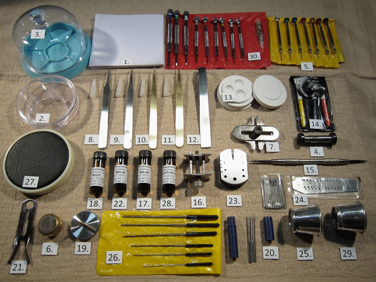 Разные часовые инструменты и расходники: пинцеты, масла, отвертки, лупы, подставка для механизма, колизвары и т.д.