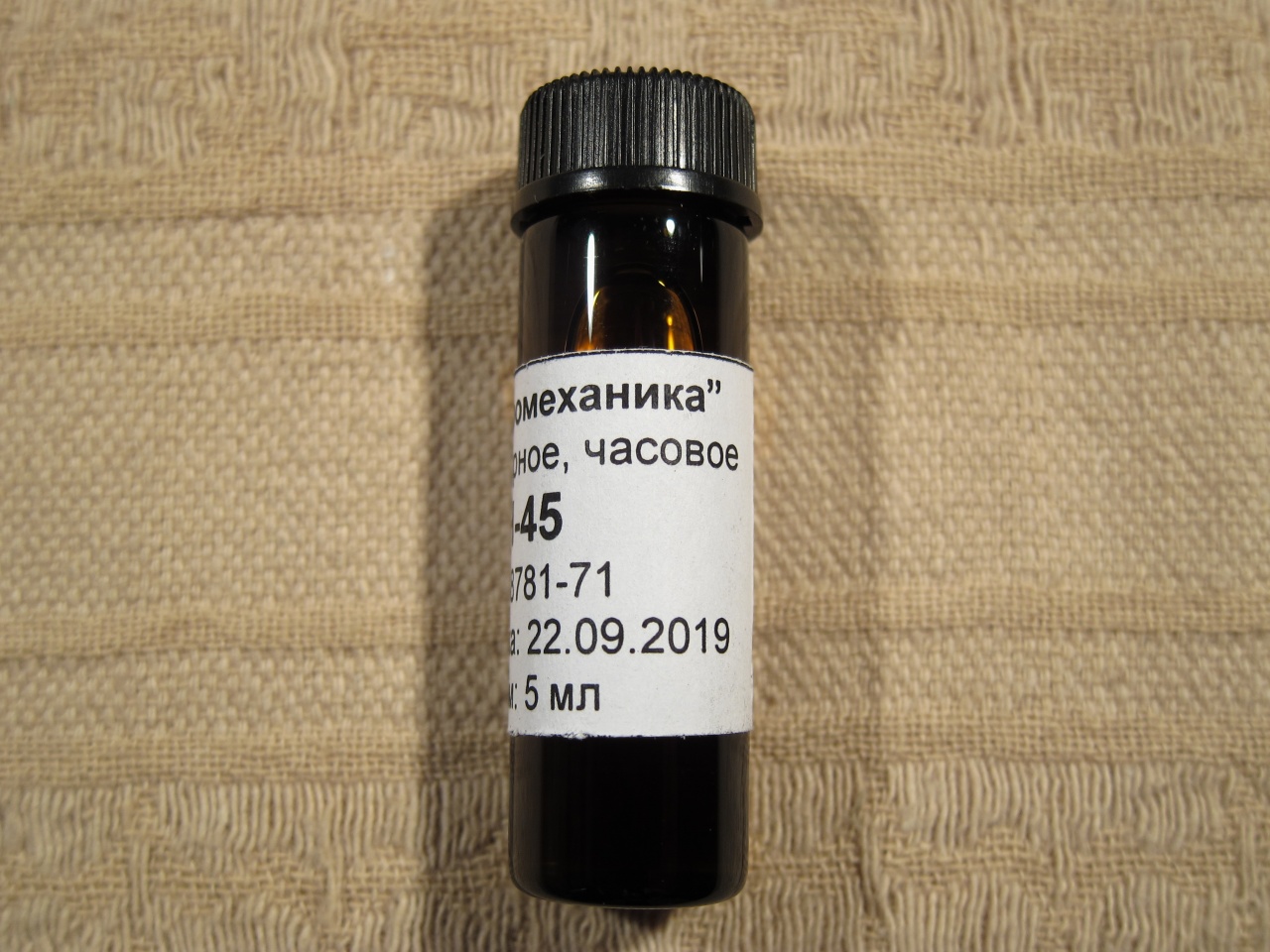 17. Масло часовое МН-45, 5 мл - 225 р. (в наличие - 1 шт.) Полусинтетическое часовое масло, производства ООО “Микромеханика”. Подходит для смазки камней баланса и палет анкерной вилки. Дата изготовления 22.09.19, объем 5 мл.