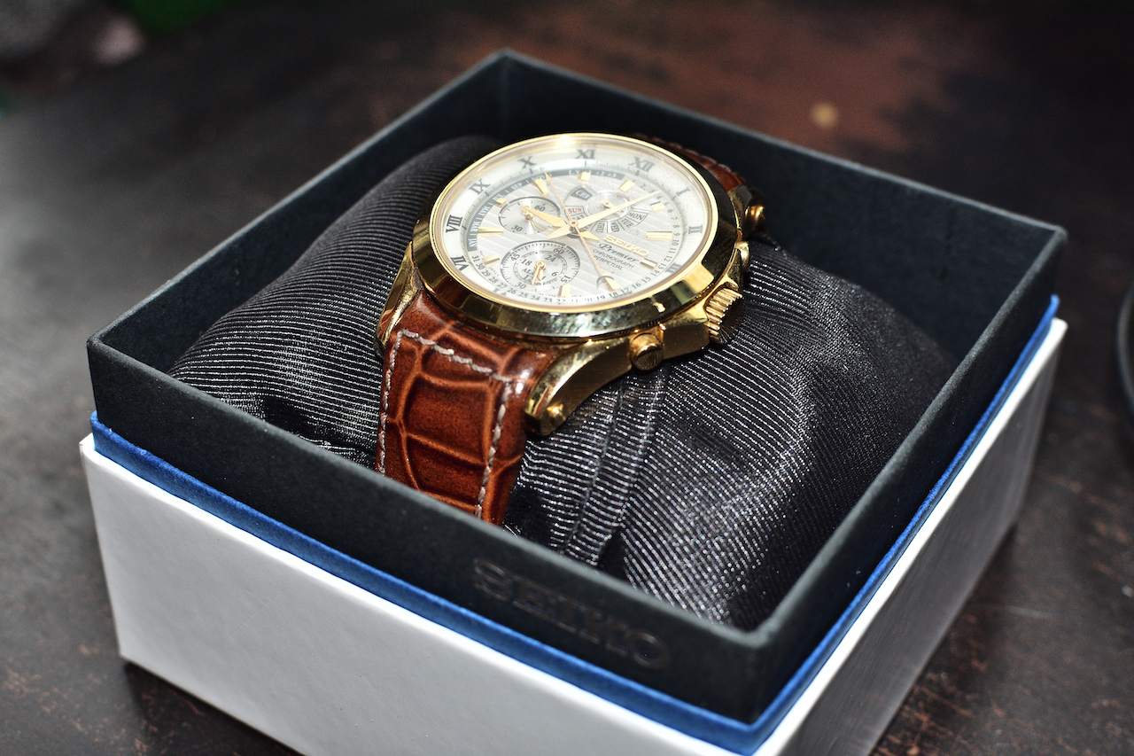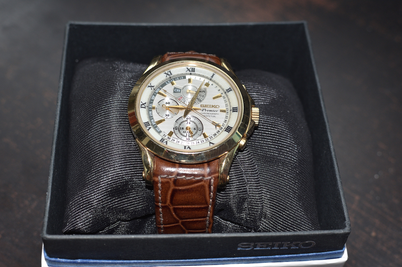 Серия Premier – это, конечно, не топ, как Grand Seiko, но часы совсем другого качества, нежели "просто" Seiko. Обалденный сложный циферблат с гильошем, не пачкающееся и не бликующее стекло, стрелки с рельефом, видимые при любом освещении и под любым углом, очень красивый оригинальный ремешок – его я поменял в 2017 году на новый и с тех пор надевал только 2 раза для фотографии.