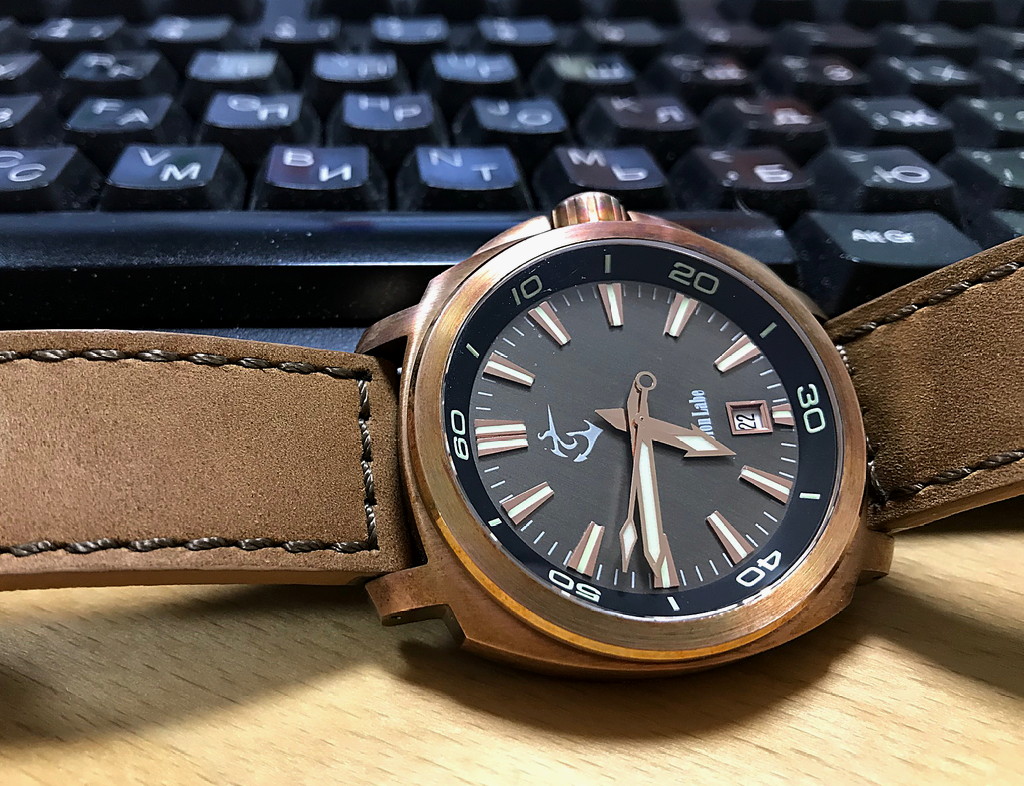 Сапфировое стекло с антибликом и некоторой купольностью. Циферблат бронзового цвета и, даже, с какой-то полосатой отделкой. Накладные часовые метки цвета полированной бронзы, но не бронза. Стрелки такого же цвета, как и метки, но тоже не бронза. Индикация часов, минут, центральная секундная стрелка и кривовастенькая дата на 6 часах. Стрелки и метки покрыты люминисцентным составом. Достаточно чахлым, если сравнивать с некоторыми другими моими часами. Светят зеленым светом ярко, но недолго.
